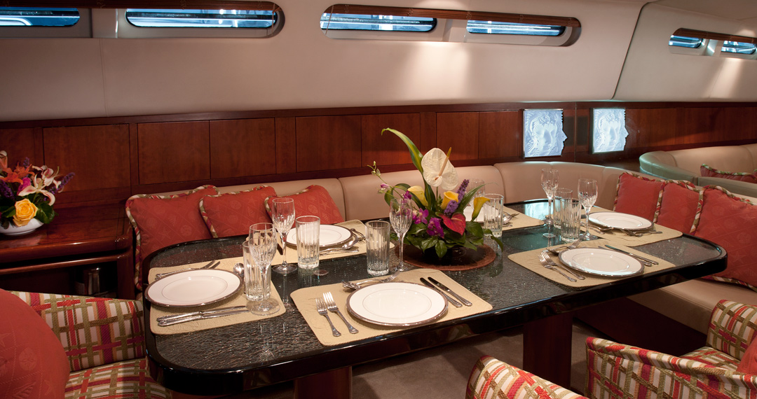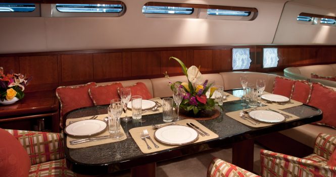 The interior boasts warm wooden colours, with the relaxing environment on board and vast spaces for socialising. The full-beam salon includes a C-shaped sofa and a dining area for eight guests.