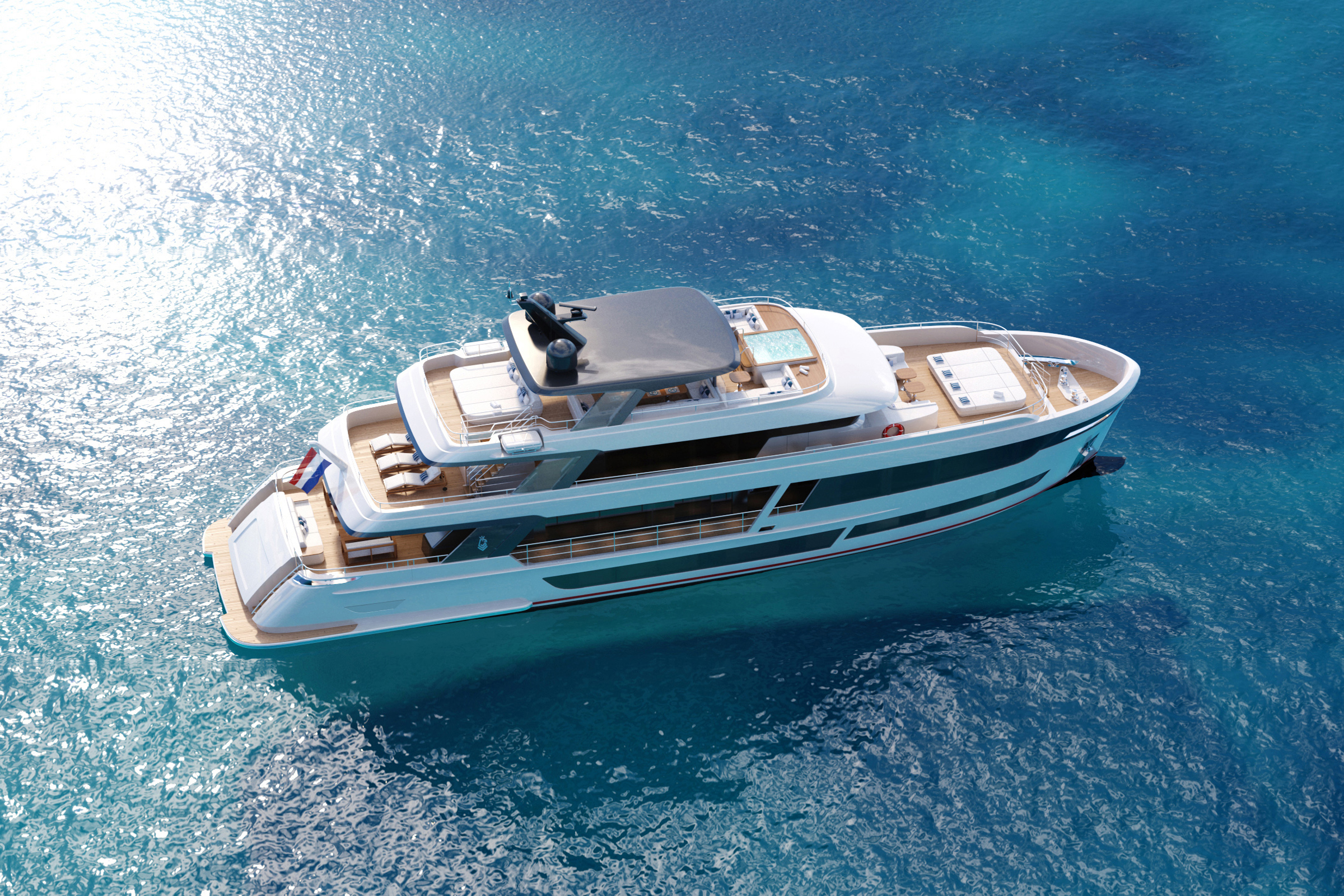 The profile features straight lines and forward-facing angles with an arch that rises diagonally from the main deck to the hard top in a single line. There are large windows on the lower deck and low bulwarks which emphasise exterior aesthetic and allow for seamless views from the main salon. The interior has a futuristic feel with super-smooth rounded shapes and a monochrome look with trims and frames that emphasise the neutral colours.