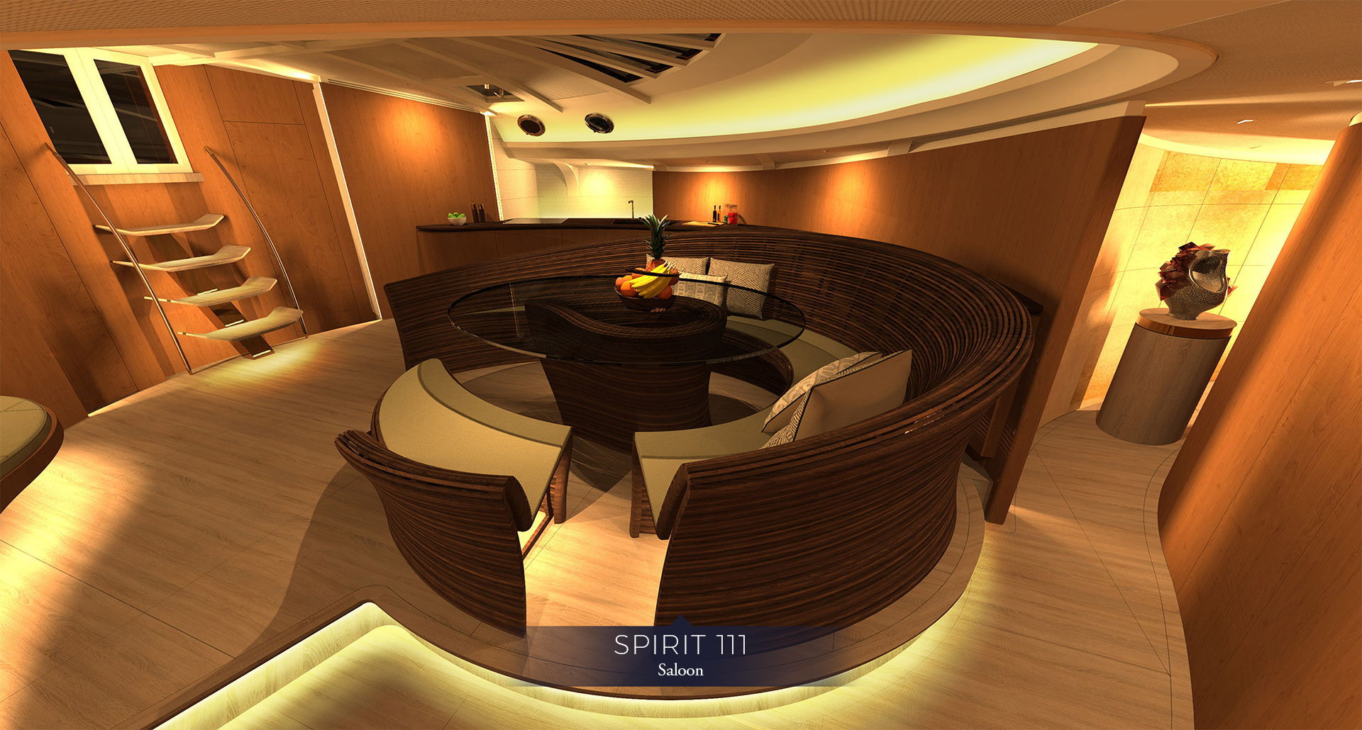 The smooth lines in the unique interior decor incorporate walls, bulkheads and furniture into a flowing design. The interior spaces designed without portholes have a warm and inviting atmosphere with a soft colour palette. Jonathan Rhoades explains. “The client had recently visited Antelope Canyon in Arizona, and this was the catalyst for the idea of the warm soft flowing walls creating unique focal points within the room. These elegant forms not only twist and peel to create counters but uniquely create the intimate backdrops for the highly detailed ‘steam pieces’ which blur the line between furniture and sculpture.”