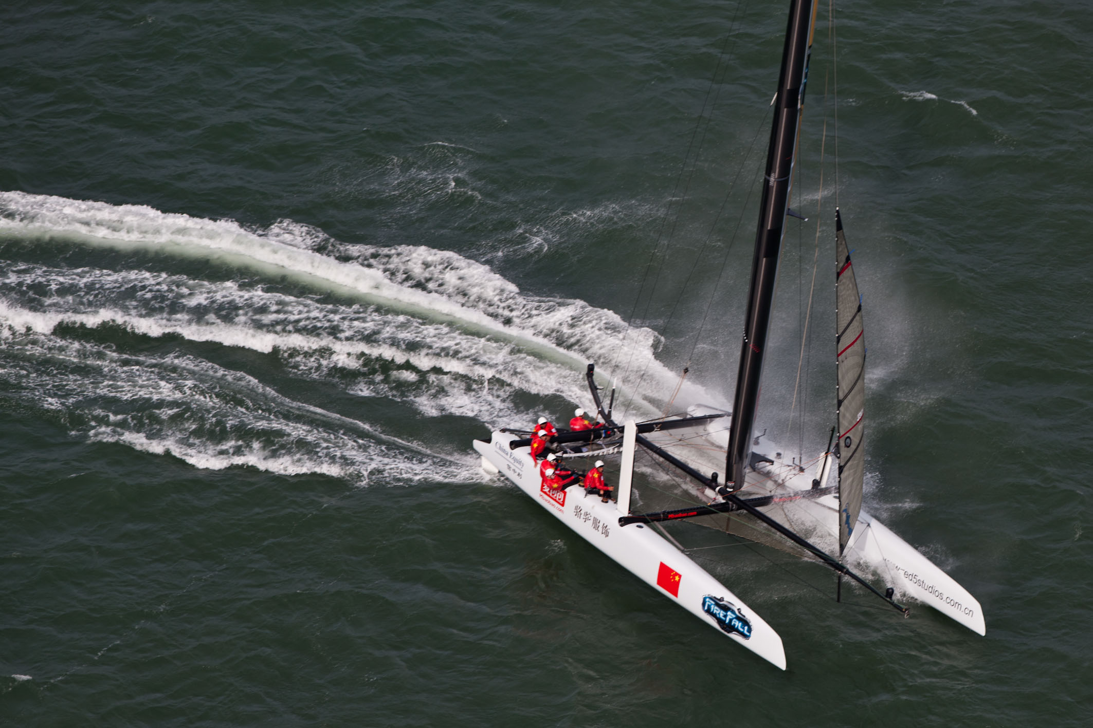 China Team, the official challenger for the 34th America’s Cup, has exceeded all expectations in the race on Sunday in Plymouth. The new crew has reached 5th position over the 2 days of sailing, and 3rd in the time trials on Sunday. The weather conditions on Sunday were extremely windy and gusty and at the upper limit for racing; the conditions were extreme and the race saw a number of capsizes and boats damaged. China Team did and excellent job in controlling the AC45 and, while there were a number of close calls, the crew was able to handle the boat to not reach the tipping point.