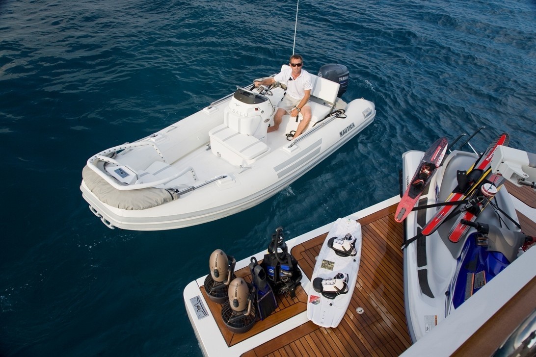 Outdoor living is laid over 3 well-appointed decks. A shaded aft deck offers seating, alfresco dining, access to the salon and steps to the swim platform, where an excellent selection of water toys are waiting. An upper aft deck is ideal for any occasion with seating, sun pads and alfresco dining. M/Y SALU has a generous sundeck, with plenty of sun pads to soak up the sun, relax and unwind, an optional shade is available.