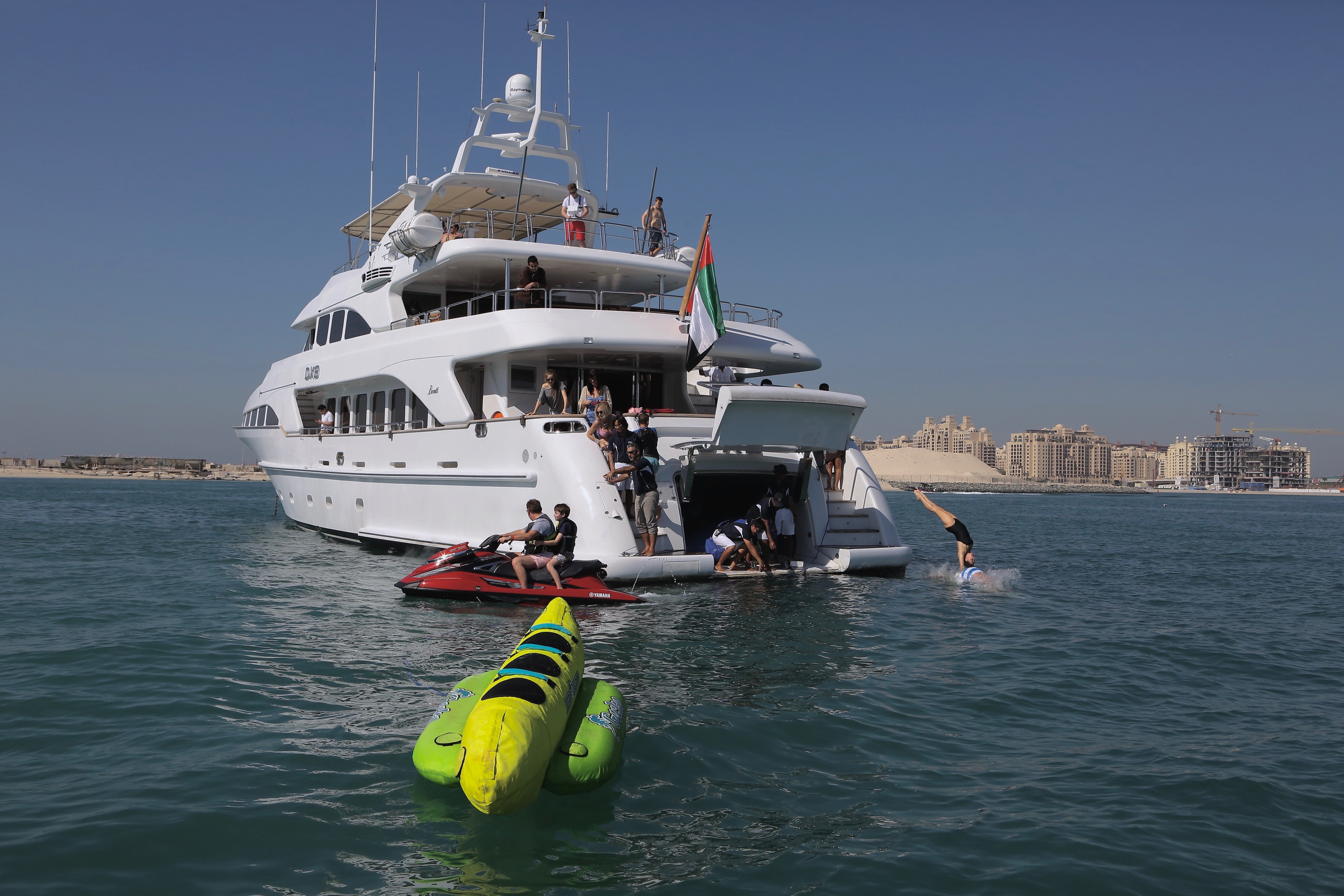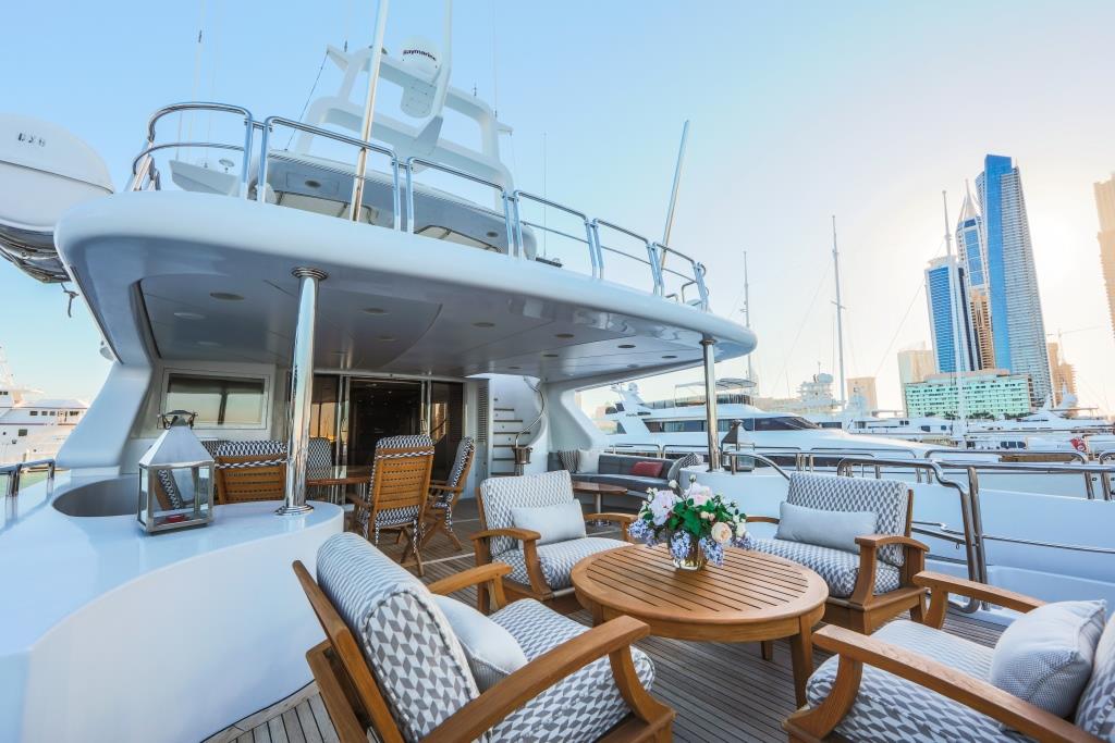 M/Y DXB has 3 exterior levels to enjoy while cruising the West Mediterranean on a charter. The aft deck is partially shaded and has an alfresco dining option. An upper deck has an outdoor lounge and alfresco dining. Her sundeck is well-appointed, complete with chaise lounges, wet bar, sun pads and Jacuzzi.