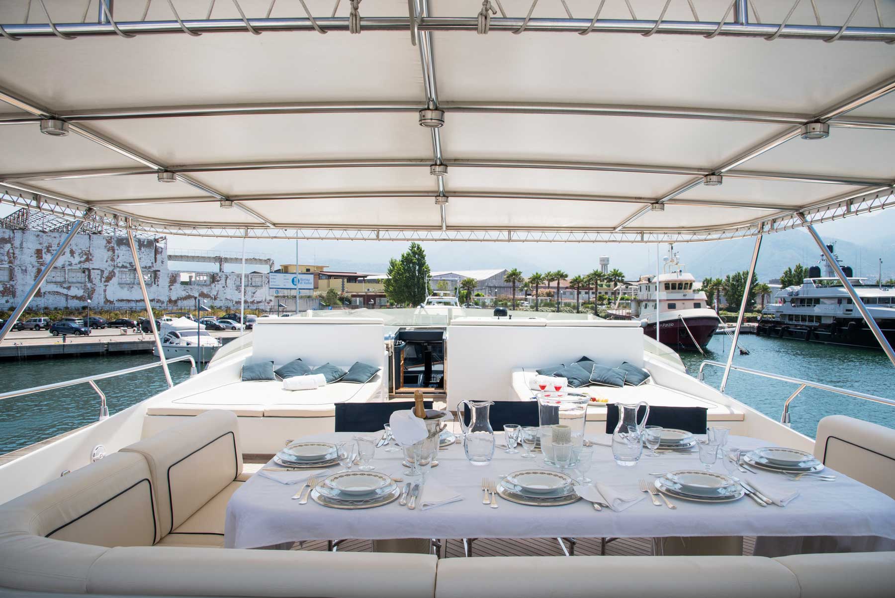 The yachts interiors and exteriors are perfect for luxury charter, easily flowing from inside to out. Her main salon boasts an open plan lounge and dining area, with wide sliding glass doors aft, connecting the space to the shaded aft deck. On the aft deck, guests can dine alfresco or simply relax. Steps lead up to the sun deck, where a further alfresco dining option and sun pads await, while side decks lead to the foredeck and raised sun pad.