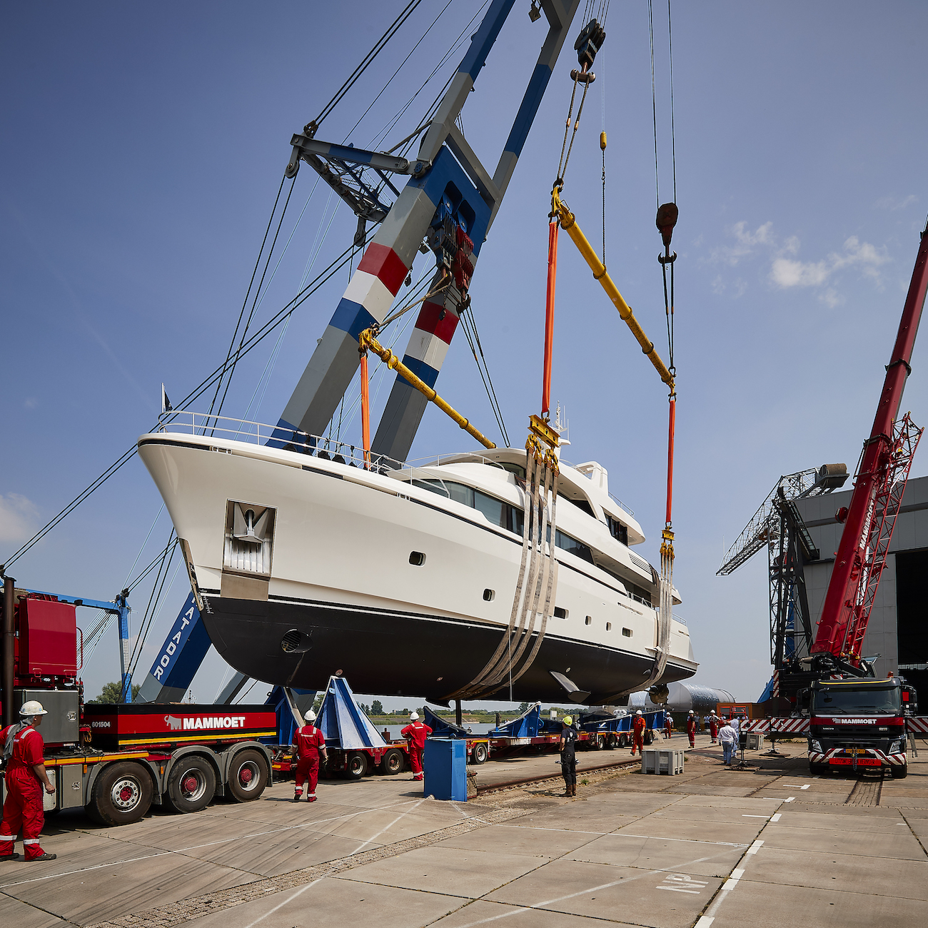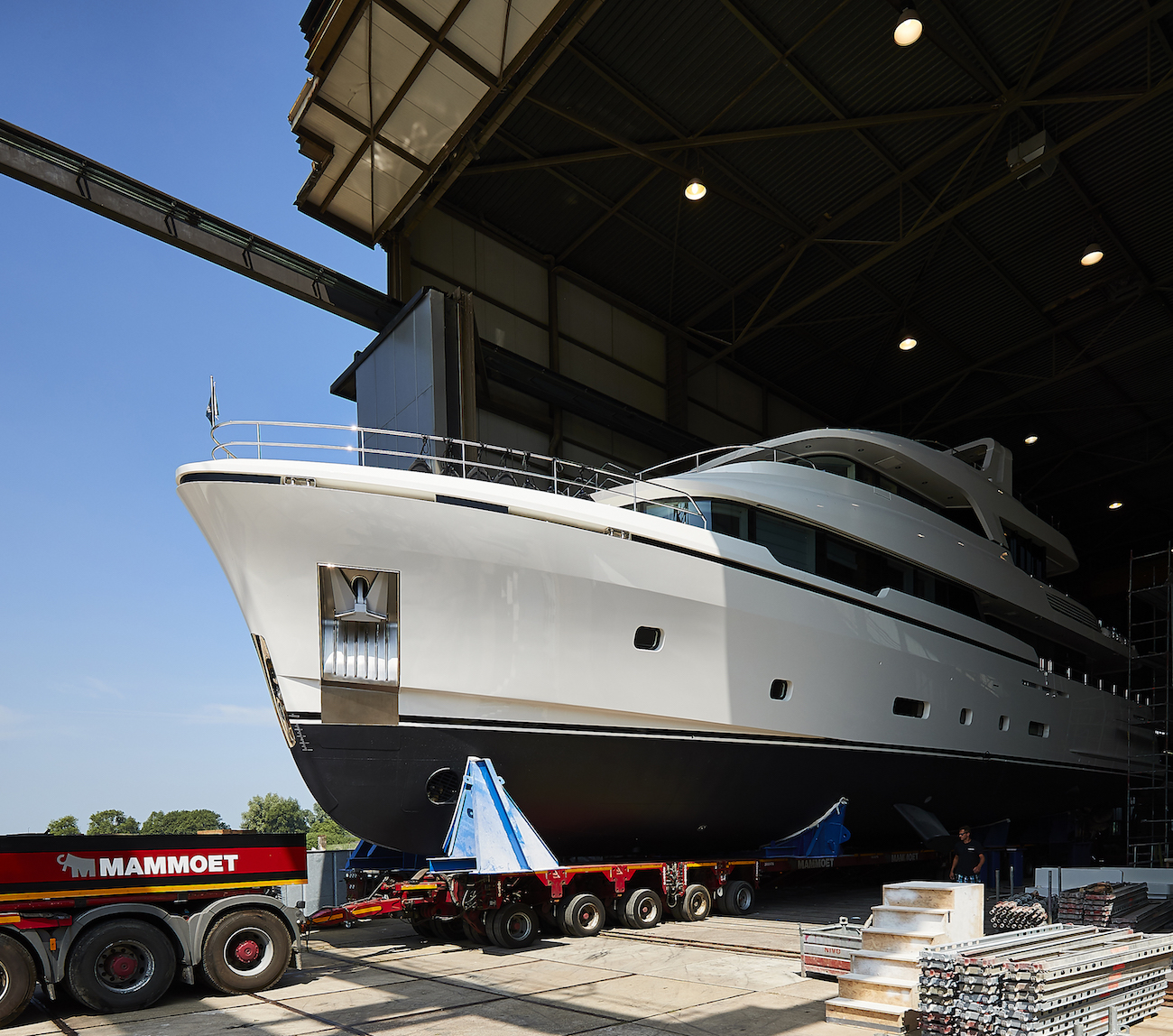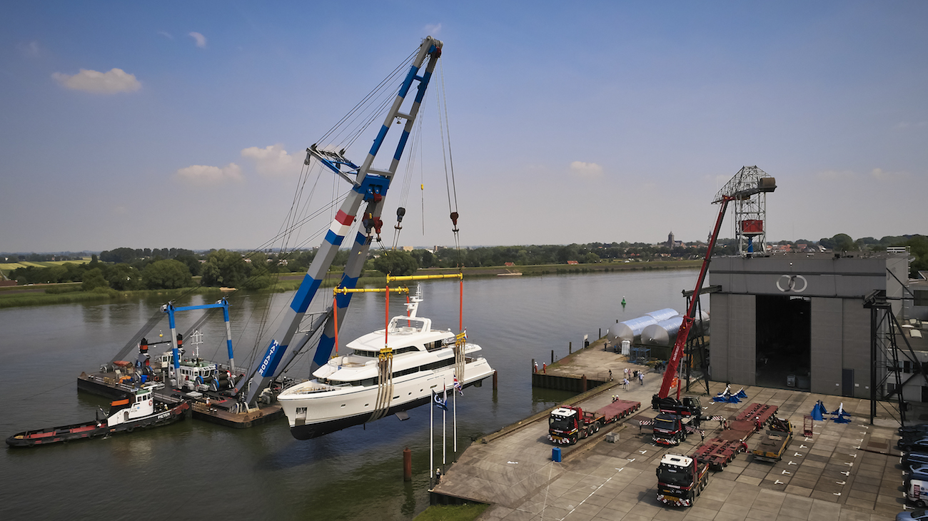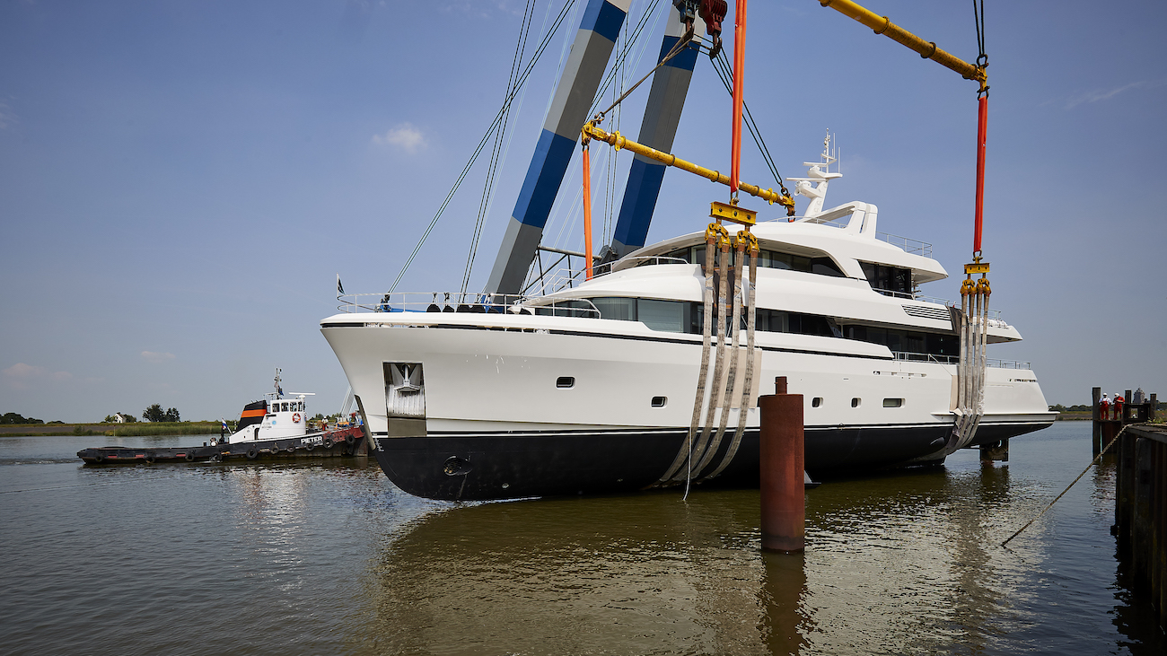 Emerging from the Dutch shipyard, onlookers were able to see the four-deck superyacht’s modern René van der Velden-styled profile out of the scaffolding for the first time.