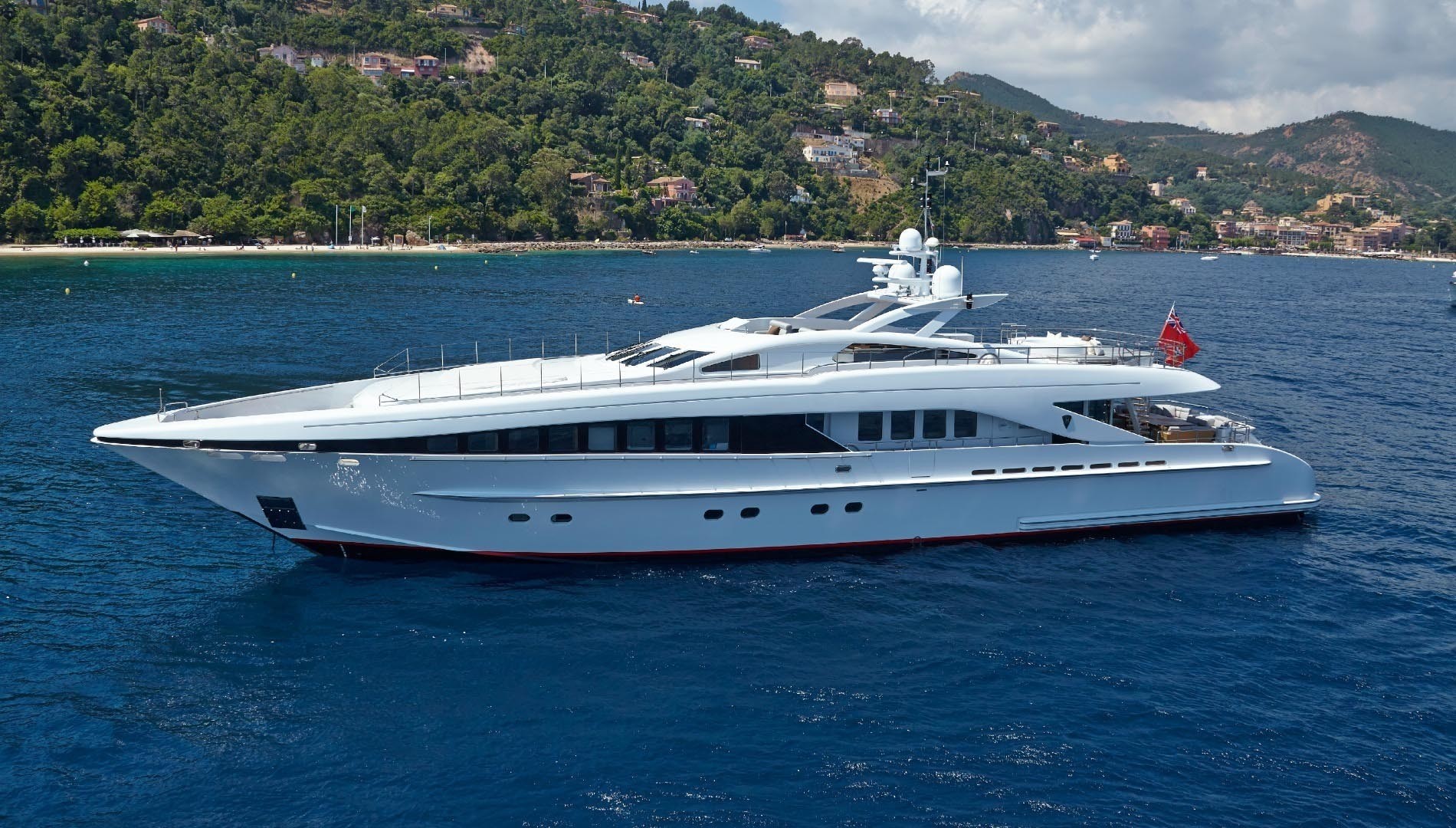 Adjacent to the salon is a shaded aft deck with alfresco dining, followed by steps to the extended swim platform and a myriad of water toys available. On the upper deck, there is an additional alfresco dining option, sunpads and Jacuzzi on the aft section, while side decks lead forward to a sprawling sunpad and built-in seating arrangement.