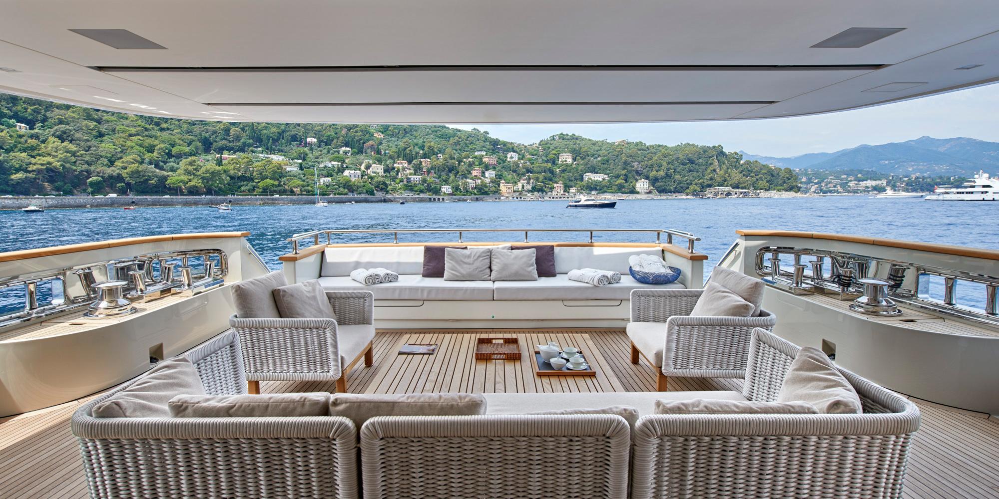 M/Y Y4H is a tri-deck design and boasts 3 levels of exterior living, as well as an extended swim platform on the transom, to enjoy the myriad of water toys on offer. The main deck aft features a casual seating arrangement, perfect for evening aperitifs. The upper aft deck has built-in seating and an alfresco dining option. Her bow area offers a Portuguese style seating area, as well as a further seating space forward. An impressive sundeck includes a Jacuzzi, exterior lounge, sun pads and chaise loungers.