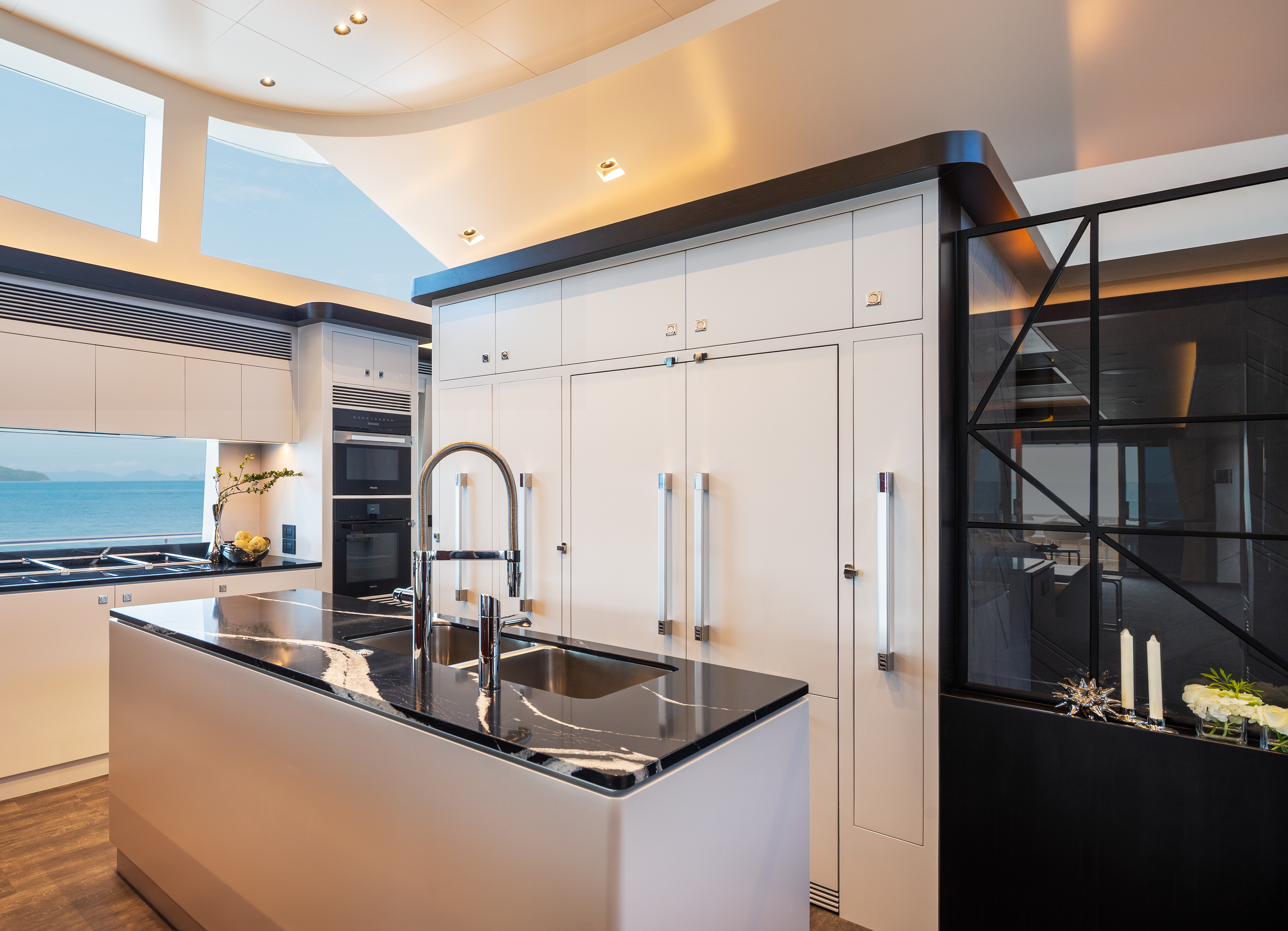 Outdoor entertainment is the focus of the split-use skylounge, which features a wet bar opposite a U-shaped sofa sheltered by the overhang which can be used as a lounge or for al fresco dining. In addition, in true Aussie style, there is a BBQ grill plus dining setting to seat eight placed aft. The foredeck is great for sunbathing while the main deck aft offers yet another outdoor dining option.