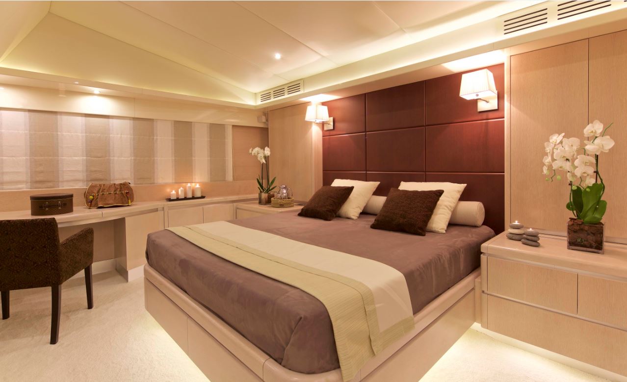 Her interior décor is light and elegant, with muted tones and pale panels throughout. There is an open plan salon with dining placed amidships on the main level, as well as a full beam master stateroom forward.