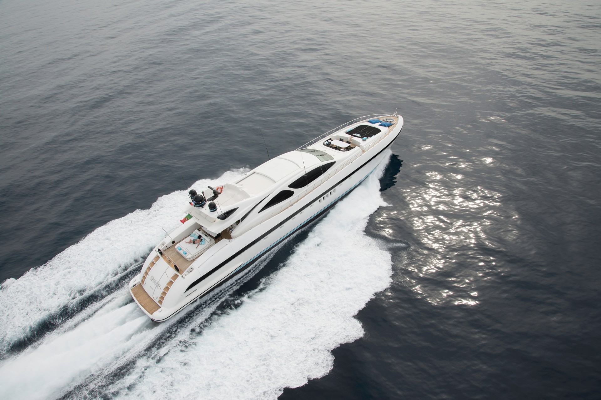 M/Y MRS GREY has excellent outdoor living, ideal for the Spanish summers. A large shaded aft deck offers alfresco dining and plenty of seating and sunning. There is a cosy seating area on the bow with an optional bimini cover. Further forward is a spacious built-in sunbed.