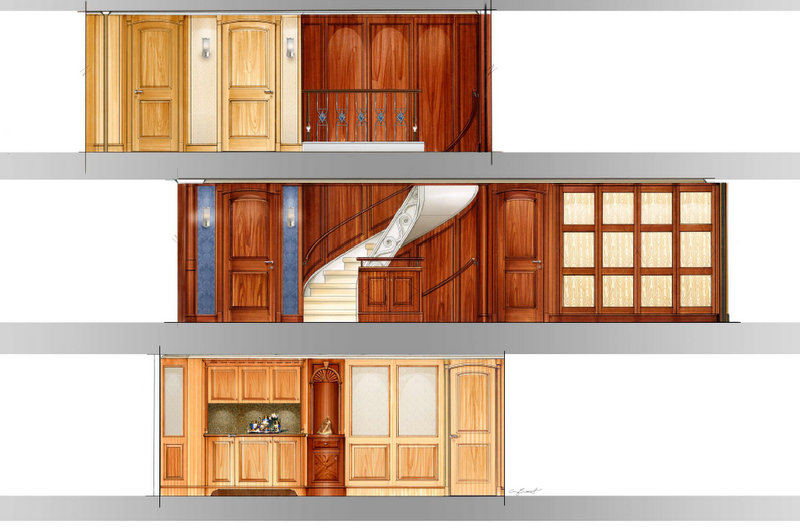 The lower deck features paneled walls of clear, straight-grained German Spessart oak, finished naturally to a light honey color. Dressers and feature furniture pieces are bow and serpentine shaped, meticulously detailed in mahogany and chestnut burl with Anigre inlay. Ceilings are white painted beams with soft fabric panels. The heads are finished with heated marble floors with the stone extending up to a wainscot with nautically inspired wall coverings. Other fabrics display a dramatic color panel of rich blue, red and green jewel tones and textures.
