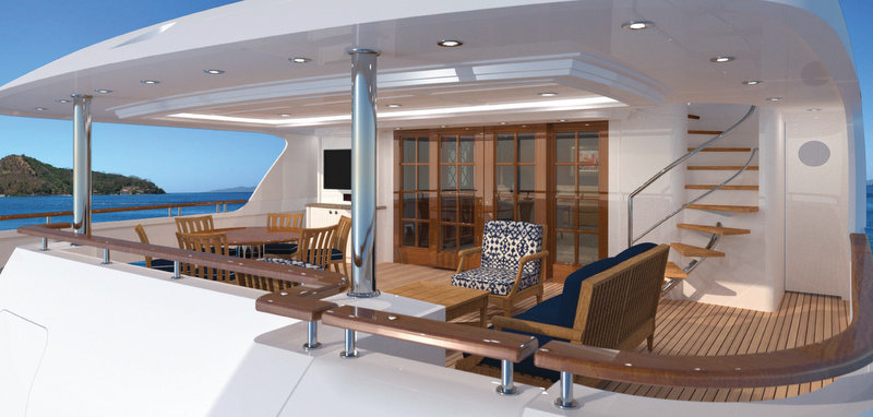While the interiors are breathtaking, so are luxury yacht ONIKA’S outdoor spaces and decks. Characterized by the same elegance as the interior, the decks flow gracefully from bow to stern. The sun deck is a complete outdoor living space, with forward facing settees, a dining table for eight with a bar and TV, as well as room for chaise lounges with an outdoor shower to cool down. A pair of tenders, 18’ & 12’, are stowed on the aft bridge deck, able to launch to either side. On the main deck, there is dining for six, and teak chairs and a lounge in a comfortable residential setting.