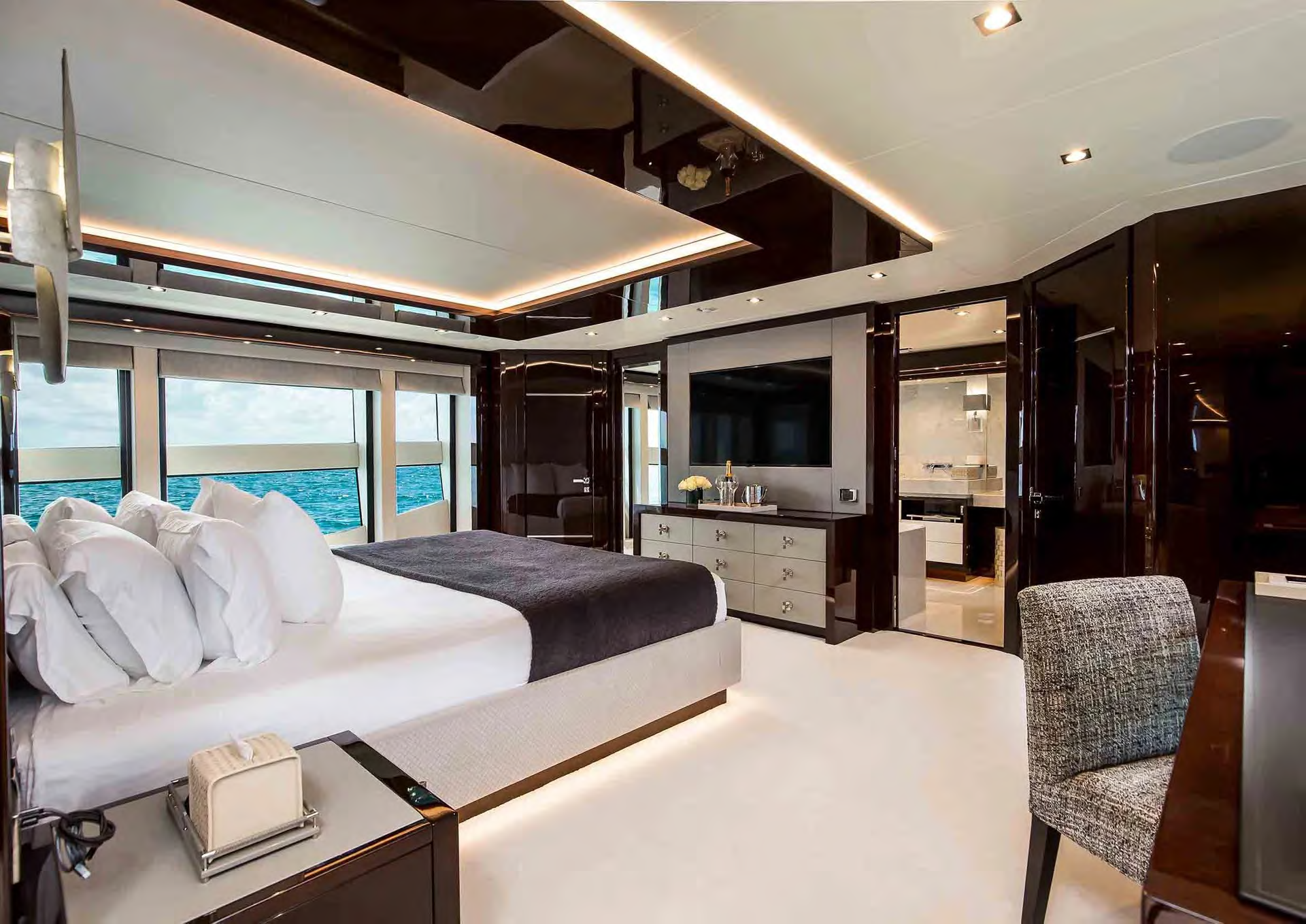 Five palatial staterooms offer accommodation for ten guests with a main deck master and four lower deck suites. Plush berths, rich textures and marble ensuite bathrooms create private havens for everyone on board. The master includes a full bathtub, a feature only found on the most premium superyachts and the twin suite offers an additional pullman bunk perfect for an additional child.