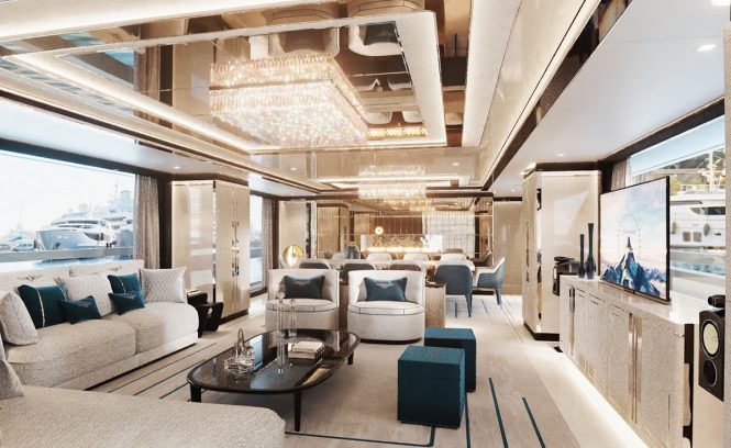 STEFANIA is sure to turn heads in any port thanks to her beautiful metallic gold hull, built entirely from aluminium. She boasts a wonderful amount of outdoor living areas, including incredibly spacious seating areas on both her main deck and sundeck. The main deck also features a wonderful swimming pool, with a jacuzzi on the sundeck providing even more options for guests to take a dip.