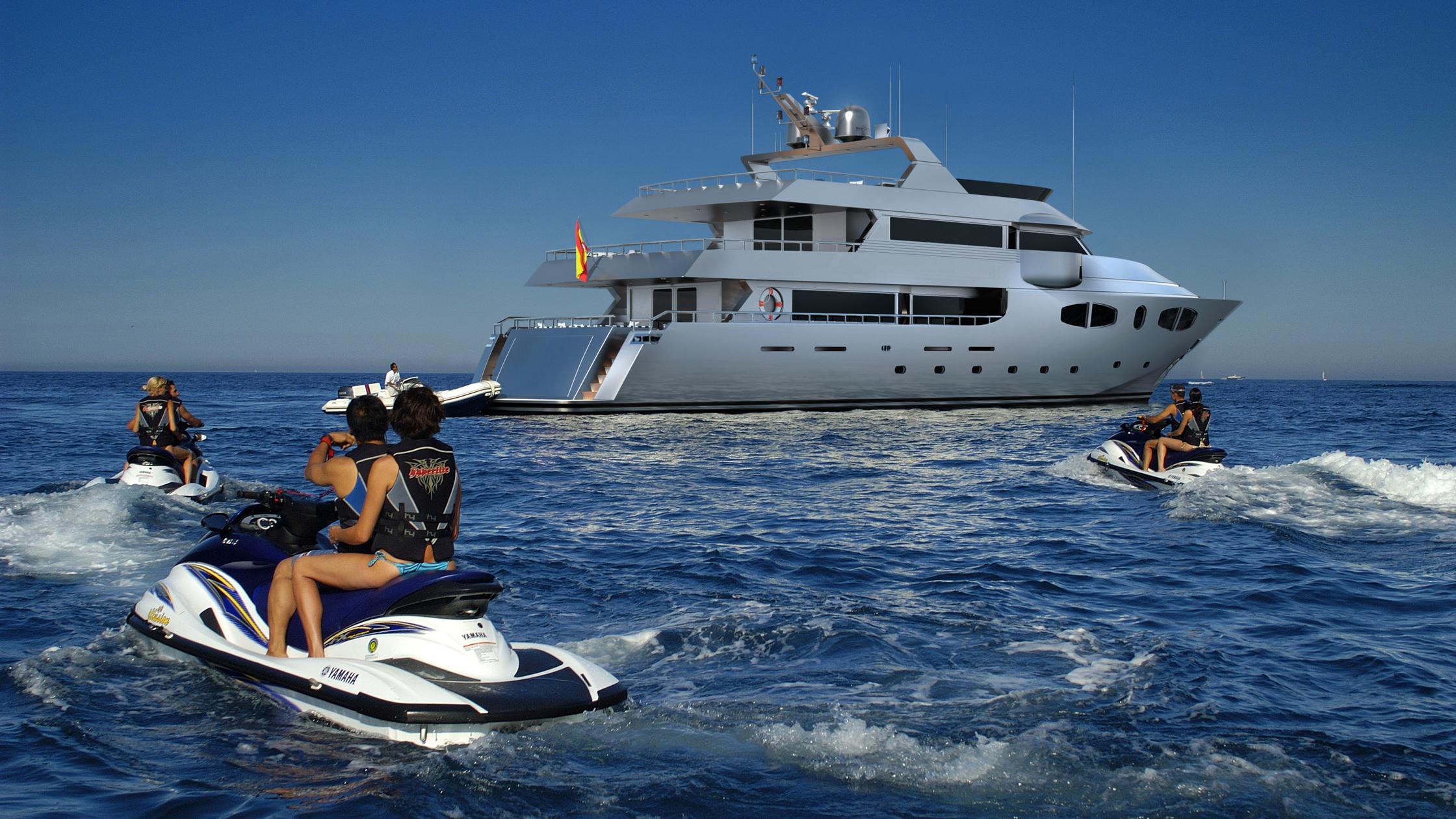 The interiors show an earth-toned colour palette with elegant neo-classical furnishings creating functional and gallery-like social spaces. Outside, the sundeck is the hub for alfresco living and has a glass-sided forward Jacuzzi, sunbeds, a sheltered alfresco lounge amidships to starboard with a wet bar adjacent. The aft section is laid out with sun loungers, which enjoy uninterrupted views out across the stern.