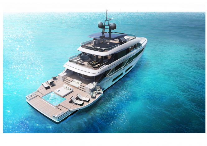 Renderings showcase the broad beach club with fold-out bulwarks to increase the sunbathing area and a spa pool as the centrepiece. As well as a large sunpad there is an aft-facing sofa, either side of which are steps leading up to the main salon.