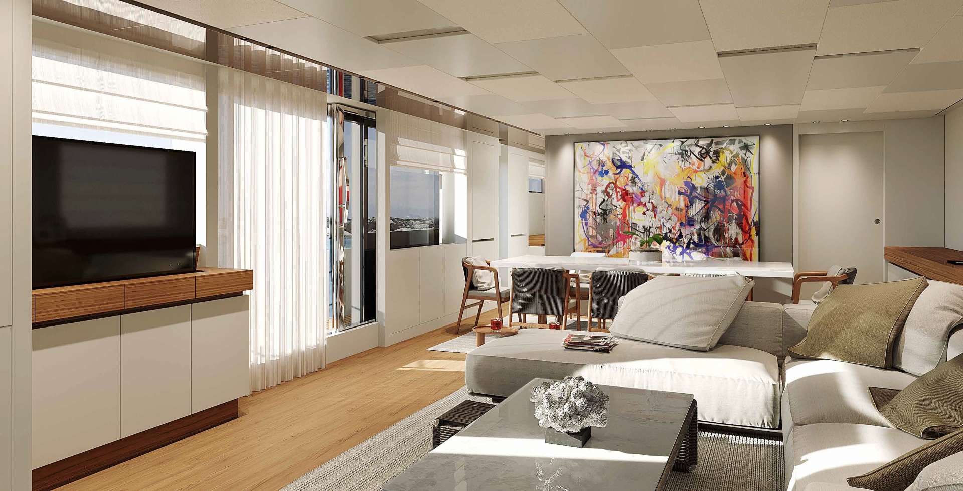 The vessel features a lovely modern beach house ambience, with excellent natural light and custom finishes. Her main salon is open plan with the dining placed forward. From the lounge, the plush sofa faces to the port side, where a fold-out balcony brings the fresh breezes in and boasts spectacular views. Aft of the space is wide sliding doors to the back deck, while forward there is the master suite.