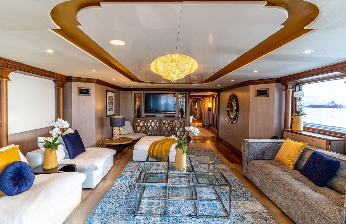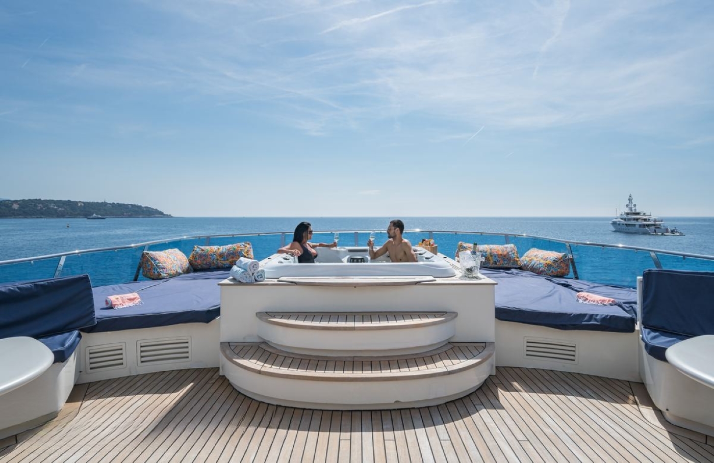 The interior includes a formal dining room and generous salon, while outside, the expansive sundeck is designed for entertaining, complete with jacuzzi, bar, and multiple lounging areas. Stabilisation at anchor and underway ensures a smooth and relaxing experience throughout.