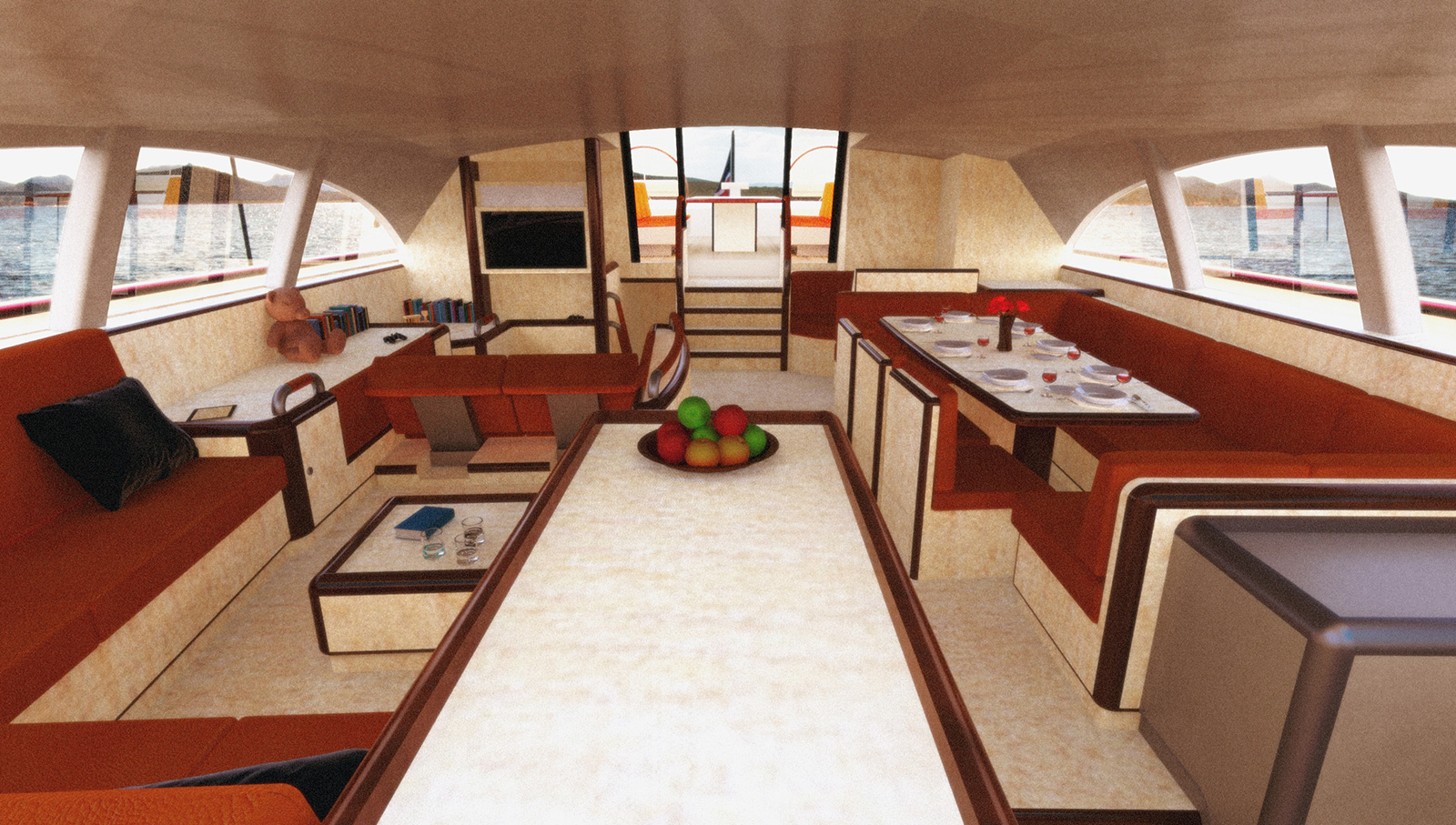 On the other hand, the most significant interior design feature is her salon, breathing an ambience of child friendliness, incorporating bright colours with dark rounded edges throughout. Its layout allows children to be able to hold onto something at any location in the saloon and offers a dedicated area for them to play within. Special seats for the children and a multifunctional wall define this ‘play zone’. The flexibility of seats support the needs of the children, whether they want to lie down, play video games, play with toys or study. In addition it allows for additional use of these seats when children are not on board. The multifunctional can hold trophies and ‘treasures’ collected by children during the voyages, such as locally found items, rocks, shells – a fun and adventurous way to record their journeys.