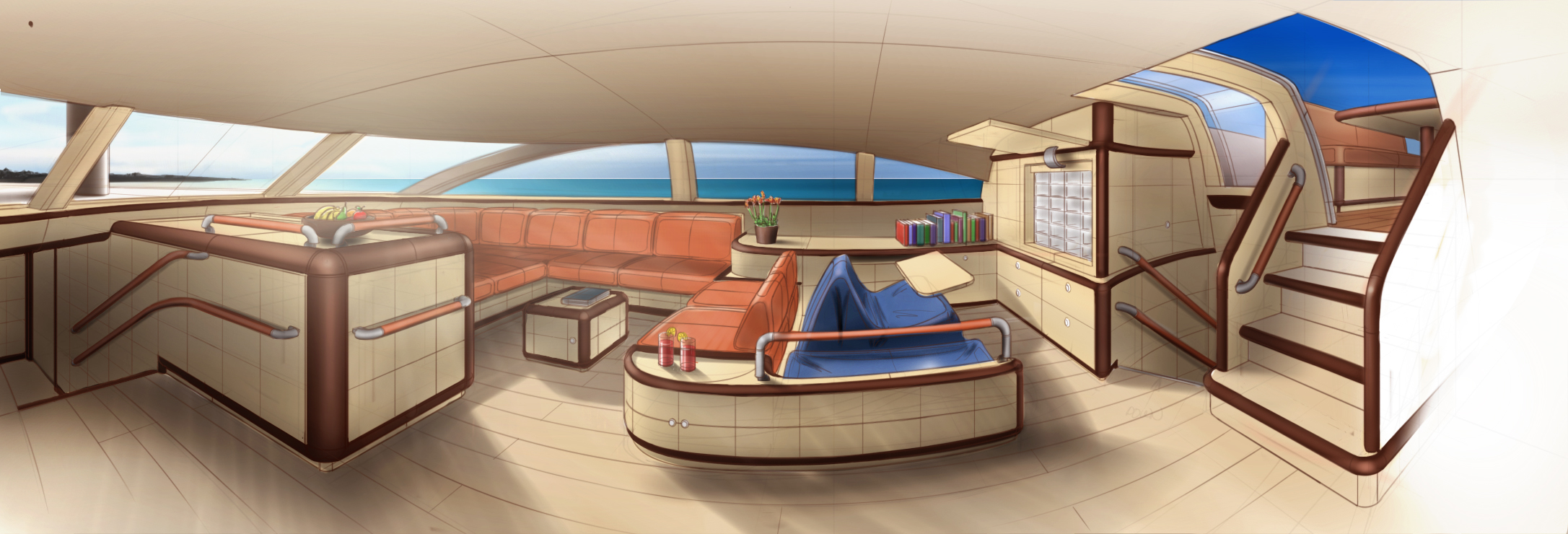 The inspiration behind the design is based on requests by a fictional client with a young family and two children aged 4 and 9. In addition the Owner is very tall (2,05m), requiring additional adjustments in design. Because a yacht of 43 metres provides larger open spaces than a smaller sailing boat, children find more difficulty in moving around, while the yacht is at sea. The handles and bulkheads to hold onto are hard to reach, due to the size of the yacht, limiting children’s enjoyment while the yacht is under sail. Surely, while the yacht is at anchor, children have fun outside, however it becomes more difficult during long crossings.