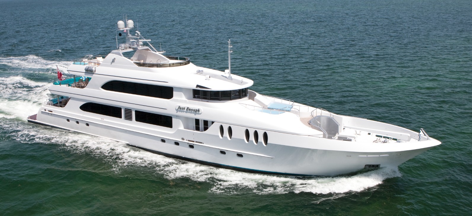 Three expansive decks boast a vast amount of exterior living areas, ideal for charter. The main aft deck has an alfresco dining table and seating, as well as direct access to the swim platform and generous assortment of water toys. On the upper deck, adjacent to the sky lounge, there is an additional alfresco dining table, seating and cocktail table. On the upper deck forward are 2 large sun pads for that quiet escape. JUST ENOUGH’S sundeck is well appointed for many occasions and includes a wet bar with seating, sun pads, chaise loungers, BBQ service station and umbrellas for optional shade.
