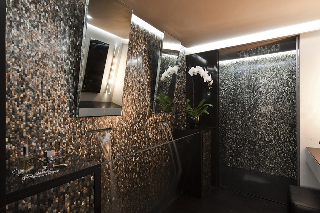 The use of Mother of Pearl and hand-crafted objects, like the lighting in the bathrooms, made of Nautilus, the luxurious bed covers, the bed site cabinets in embossed leather remind of the fish in the sea, was designed to resemble the environment and shapes of the deep sea creatures.