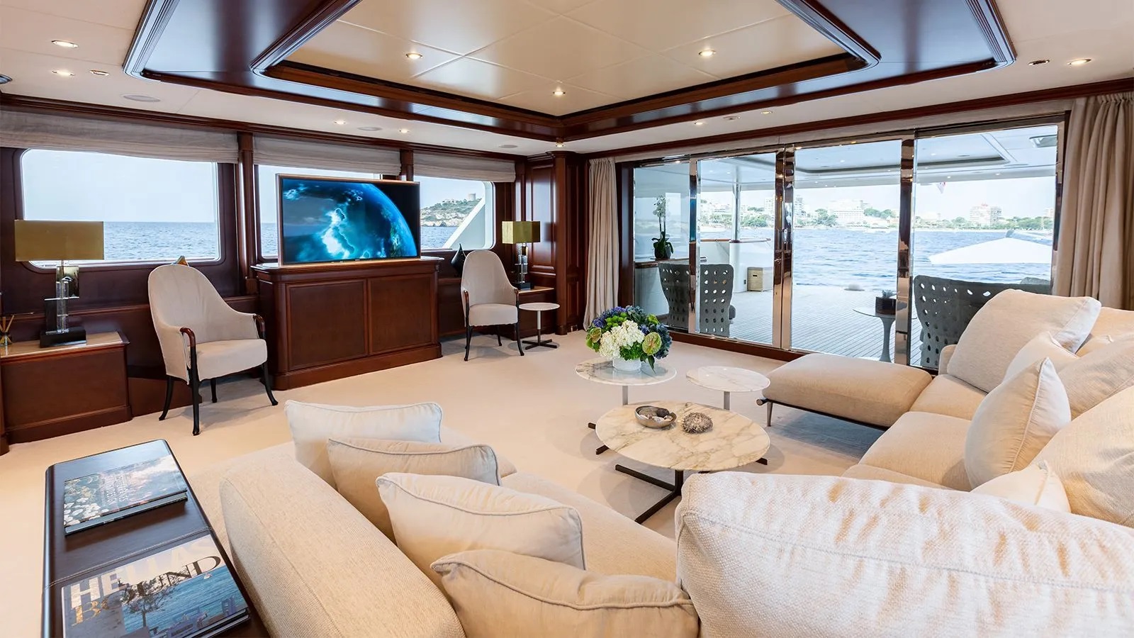 Her classic motor yacht profile, with elongated bow and three deck levels, is complemented by the traditional wood panelling and rich soft furnishings throughout the interior. The elegant upper and main deck salons provide plenty of welcoming space for guests, while out on deck beautifully furnished al fresco entertainment areas provide the ultimate in comfort. The water’s edge platform can be set up with sun loungers and an array of water toys to create a fabulous beach club.