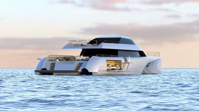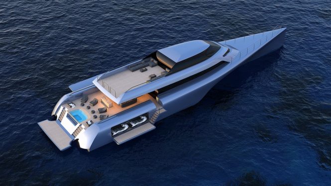 The concept shows generous alfresco living spaces and from the large fold-down swim platform two staircases sweep up to the main deck aft. The broad 11.25m/36.9ft beam is put to use in providing a large glass-sided spa pool surrounded by seating and sun loungers, while beneath the sundeck overhang a wet bar is placed in the shade.