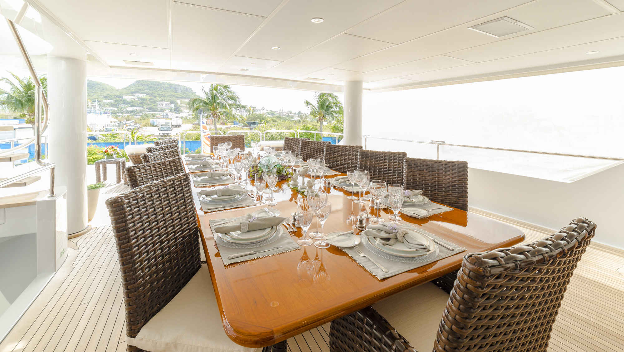 M/Y ONE MORE TOY is ideally suited to Tropical weather cruising, thanks to her vast exterior living space. Relax under the protection of shade on the main aft deck, while watching your loved ones enjoy the water toys from the extended swim platform. For a casual dining experience, the upper deck boasts a table for 12 and plenty of seating. Her well-appointed sundeck includes sunning, seating, tables, cocktail bar and a deluxe jacuzzi.