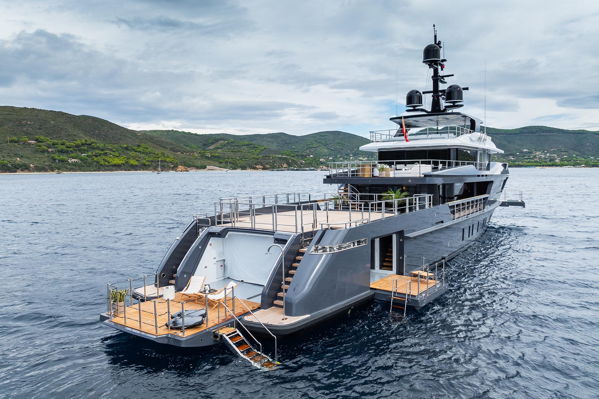 Her robust exterior is contrasted with elegantly curved furnishings and seating arrangements both inside and out, with exteriors from the renowned designer Francesco Paszkowski and interiors by Studio Indigo. She is topped with a luxurious sun deck featuring a lounge, bar and glass-sided jacuzzi and boasts a deluxe beach club at the water’s edge. Her huge aft deck is a versatile space which can be used as a helipad, for toy storage or even for a special event.