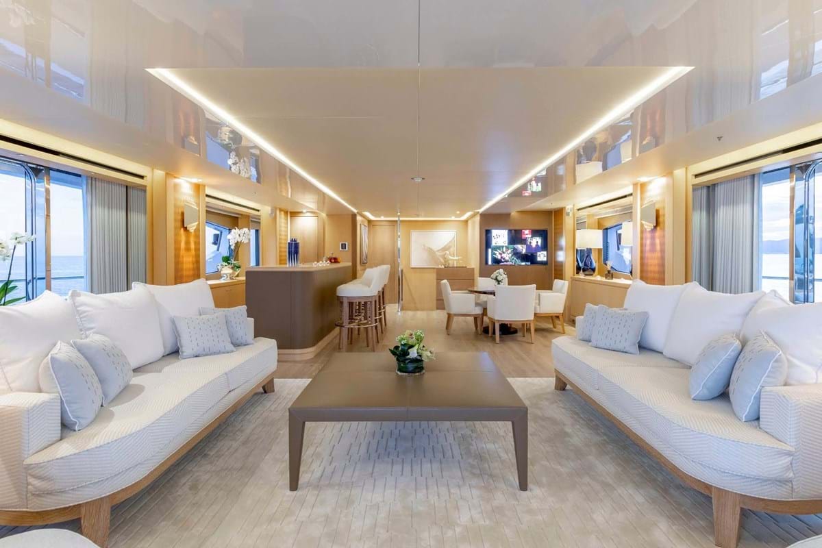 A beautifully appointed contemporary interior invites a luxurious ambiance. Her open plan salon offers a generous lounge, cocktail bar and formal dining, all surrounded by panoramic windows, allowing in plenty of natural light. An upper sky lounge boasts another wet bar, seating, games table and entertainment systems.