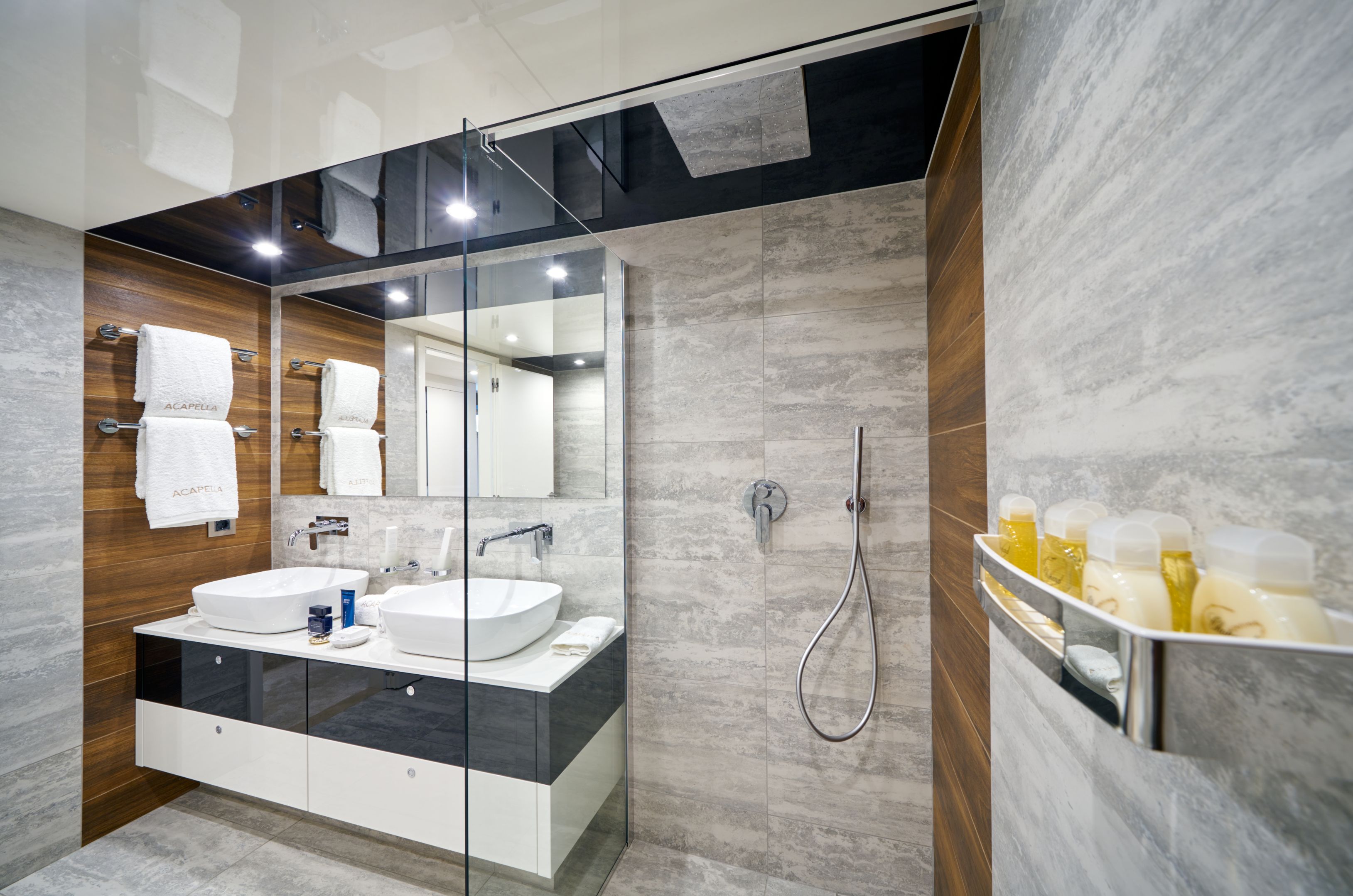 Once inside, the elegant décor continues with plush carpets, contemporary neutral soft furnishings and huge windows to keep guests connected to the beautiful surroundings. The five lower deck staterooms offer flexible accommodation for up to twelve guests: three master cabins and two triples with a double and single bed are perfect for families or groups of friends. Ensuite bathroom facilities in each stateroom ensure the utmost privacy of all guests.