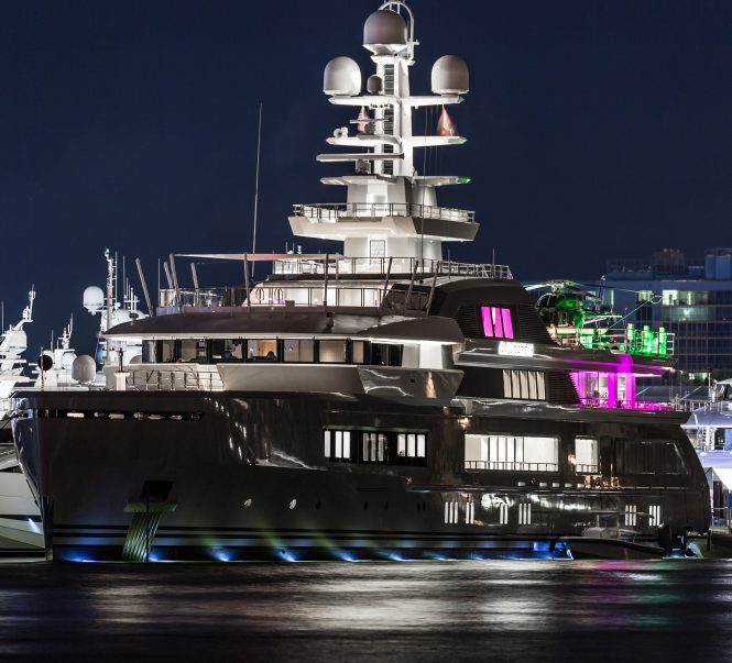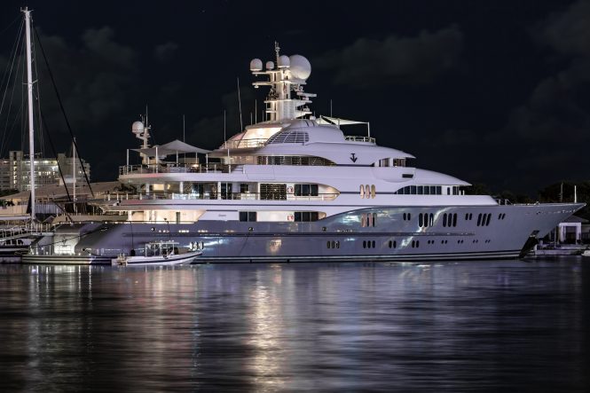 The Fort Lauderdale International Boat Show earlier this month was an excellent time to capture superyachts up close and looking their best, including luxury yacht TV (ex.MADSUMMER) from Lurssen. This 78m/257ft superyacht was built in 2008 with her last refitted in 2015, and she is a popular choice for charter due to her unrivalled wealth of amenities, including status as a PADI Certified Dive Centre and a massive collection of water toys, a spa, sauna, beauty room, swimming pool and a cinema.