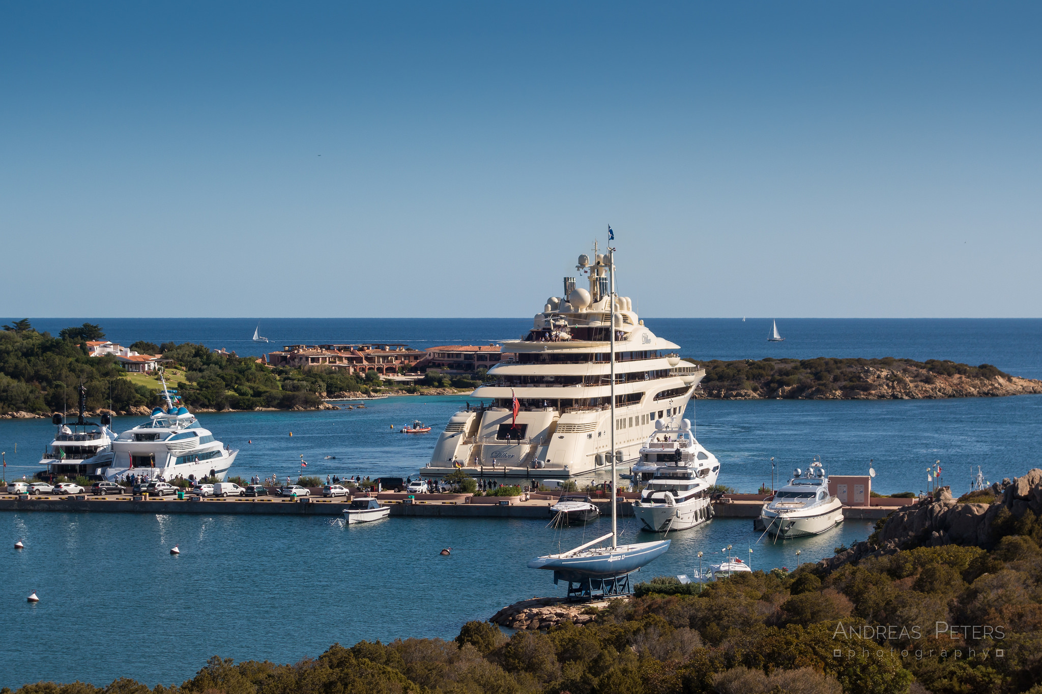 Spotted in the Porto Cervo in September, 156m/512ft superyacht DILBAR from Lurssen dwarfed all other luxury yachts at the marina. Capable of accommodating up to 24 guests across 12 cabins, she comes equipped with two helipads, a sauna steam room, massage room, cinema and a swimming pool. M/Y DILBAR has an impressive crew of 96 and also won two awards in 2017: