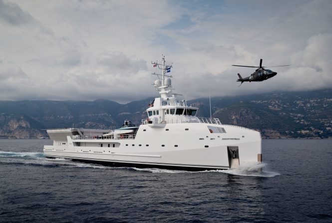 Launched by Damen in 2017, GAME CHANGER is a 69m/227ft support vessel designed for exploration and capable of cruising solo. Her on board amenities include a dive centre and a helipad, while her accommodation sleeps up to 12 guests over 6 spacious cabins. With plenty of space below deck, she is ideal for expeditions and for transporting large water toys.