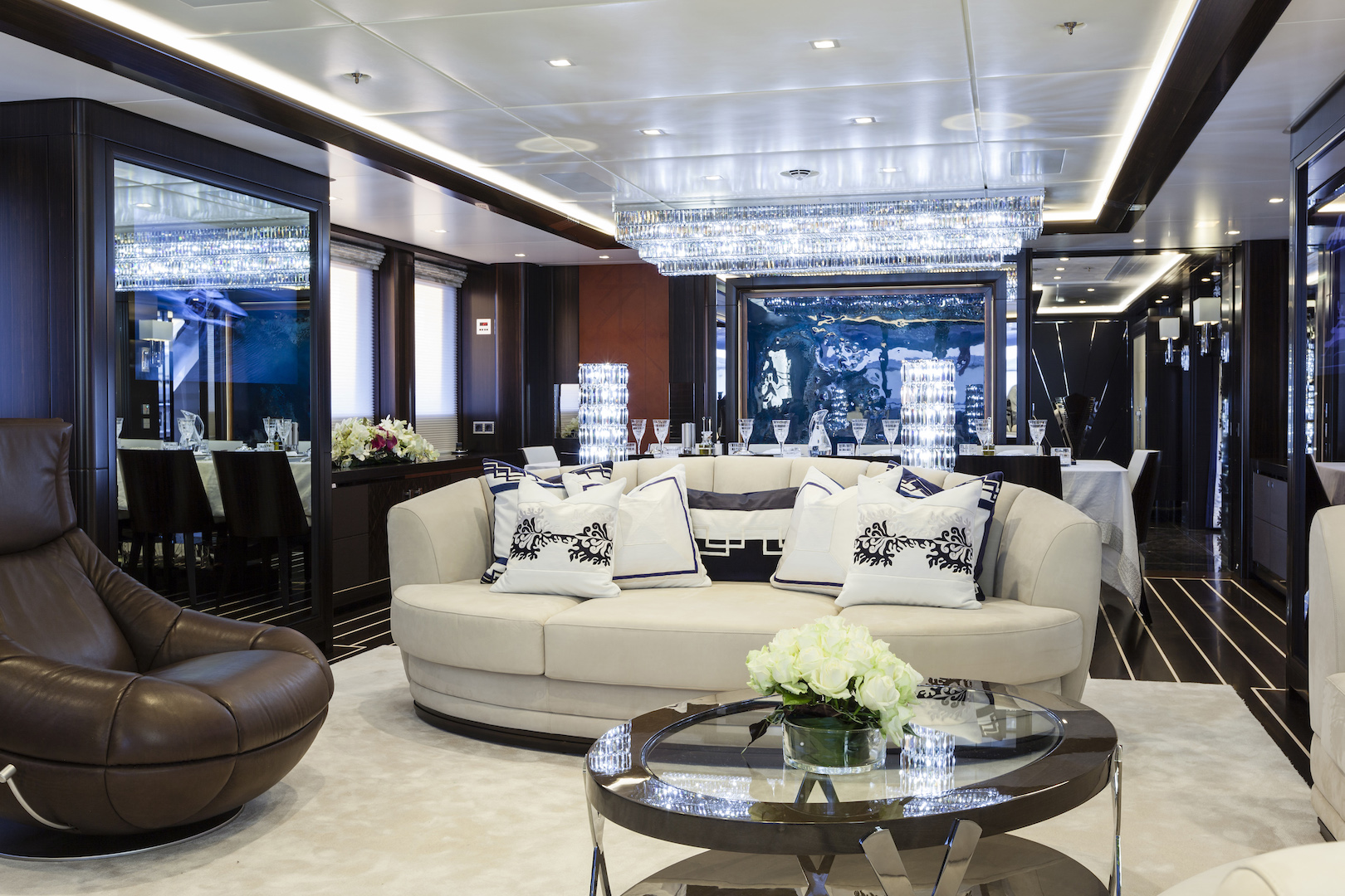 Within, the bold geometry of art deco is timeless: Even in an era of crisp clean lines the elegance of a motif from the 1920s resurfaces time and again for its elegance and charm, and there is no doubting the opulence aboard LADY LI. Precious and semi-precious stones have been used throughout, creating stunning lobbies, back-lit bars and wall panels and intricate wall designs in the en-suite bathrooms. From the chandeliers to the door handles, the detailing is minute and whether chartering for a special occasion or as an indulgent treat, M/Y LADY LI is filled with ambience.
