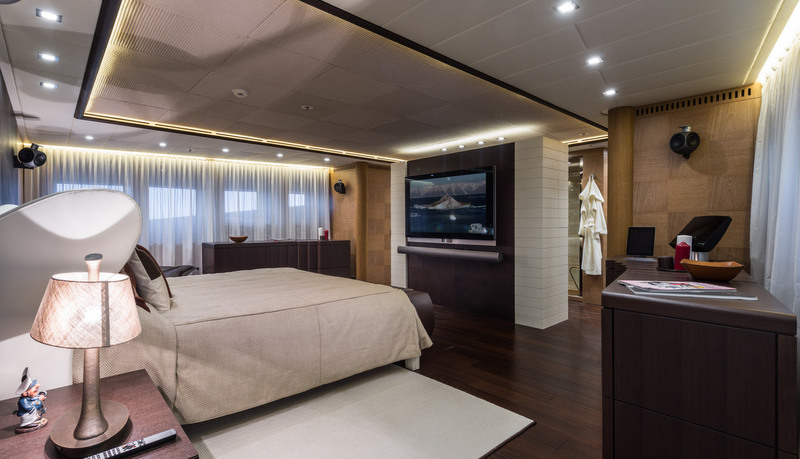The full beam, soberly decorated cabin, opens into a large bathroom and adjoining dressing rooms. Loro Piana fabrics and bedspread, custom made bed head and an odd Poliform Wallace chair in dark brown leather underline the sober, masculine decoration. A private staircase connects the Owner suite to a saloon/study on the Upper Deck, a panoramic hideaway with great views towards the bow.