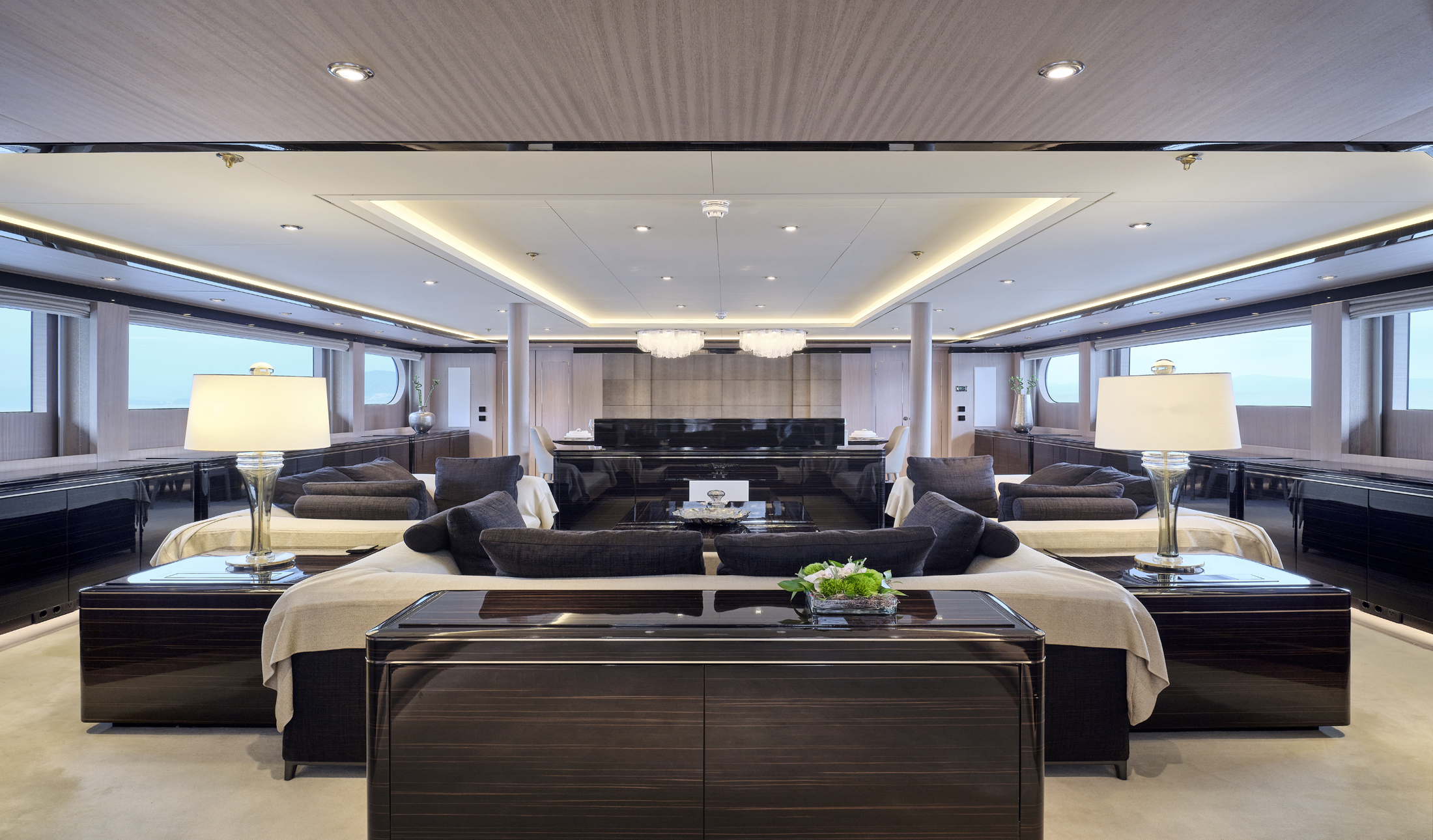 The yacht’s layout includes a full-beam Master Suite on the main deck with a private study and his-and-hers walk-in wardrobe, two VIP suites, and two twin cabins – both of which are convertible to doubles – located on the lower deck.