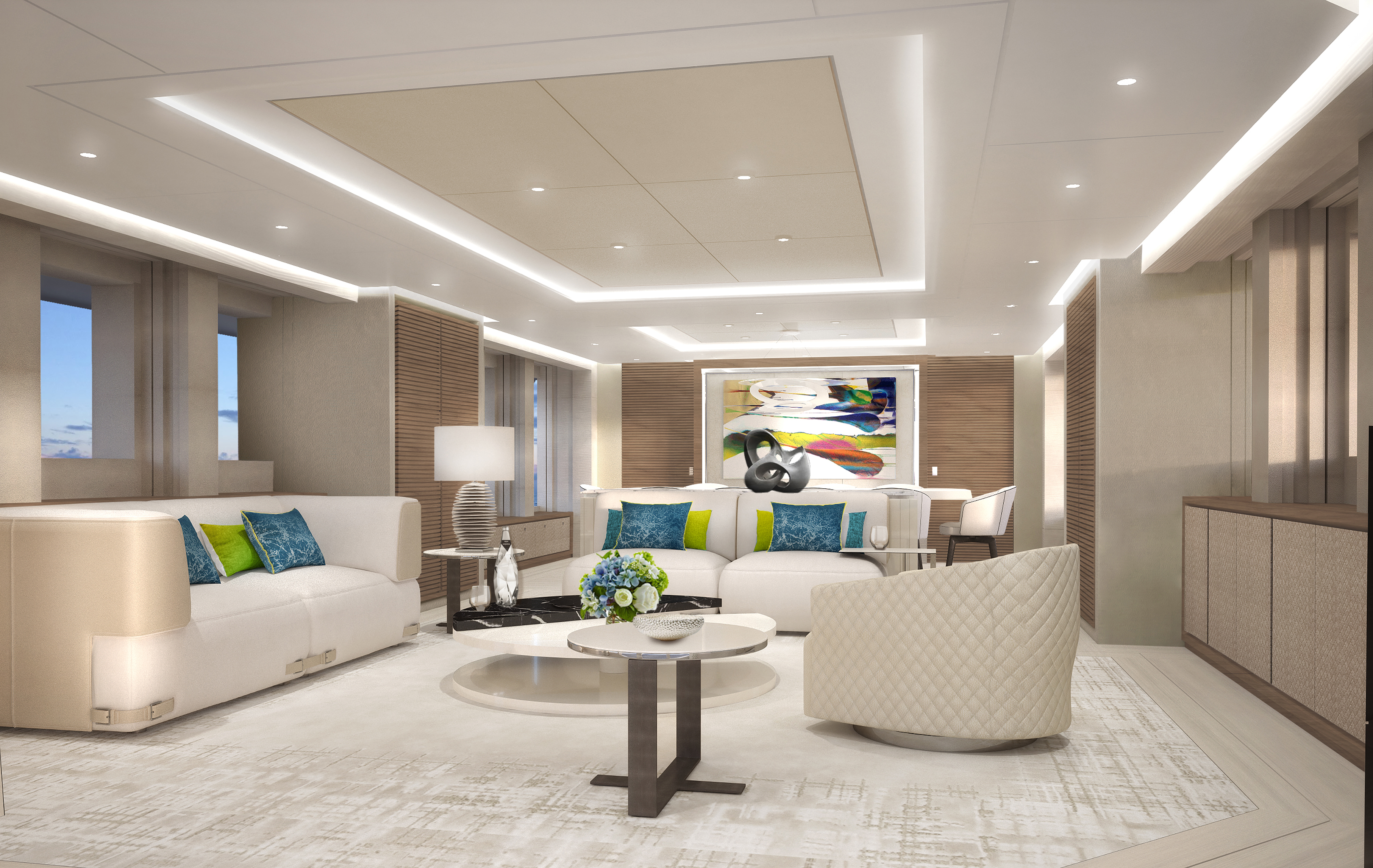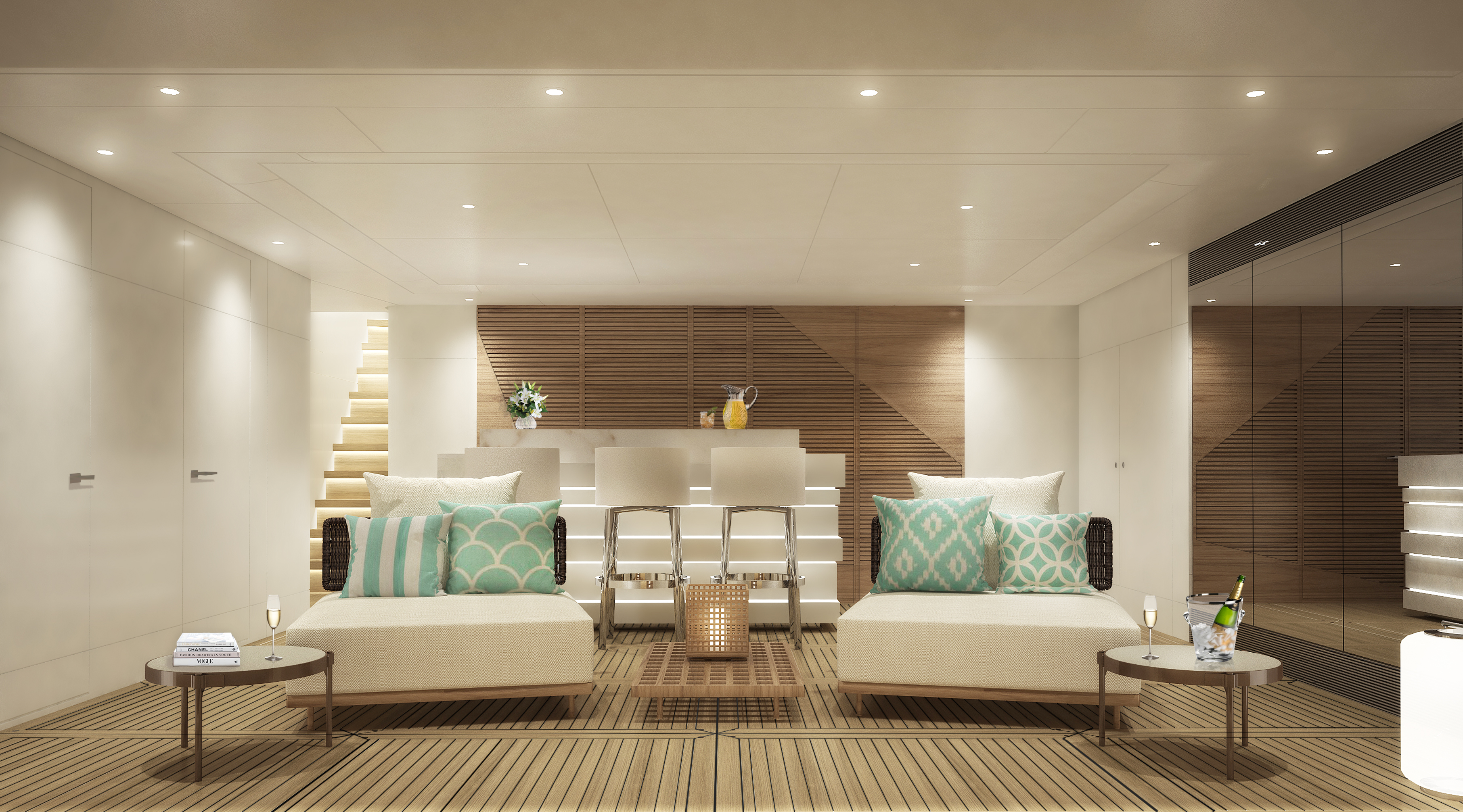 The interiors from Reymond Langton Design place an emphasis on simple and clean living with soft curves to create dream-like surroundings. The white furnishings and teak decking are contrasted with accents in green and blue, ranging from light to dark hues to give each room a personalised appearance.