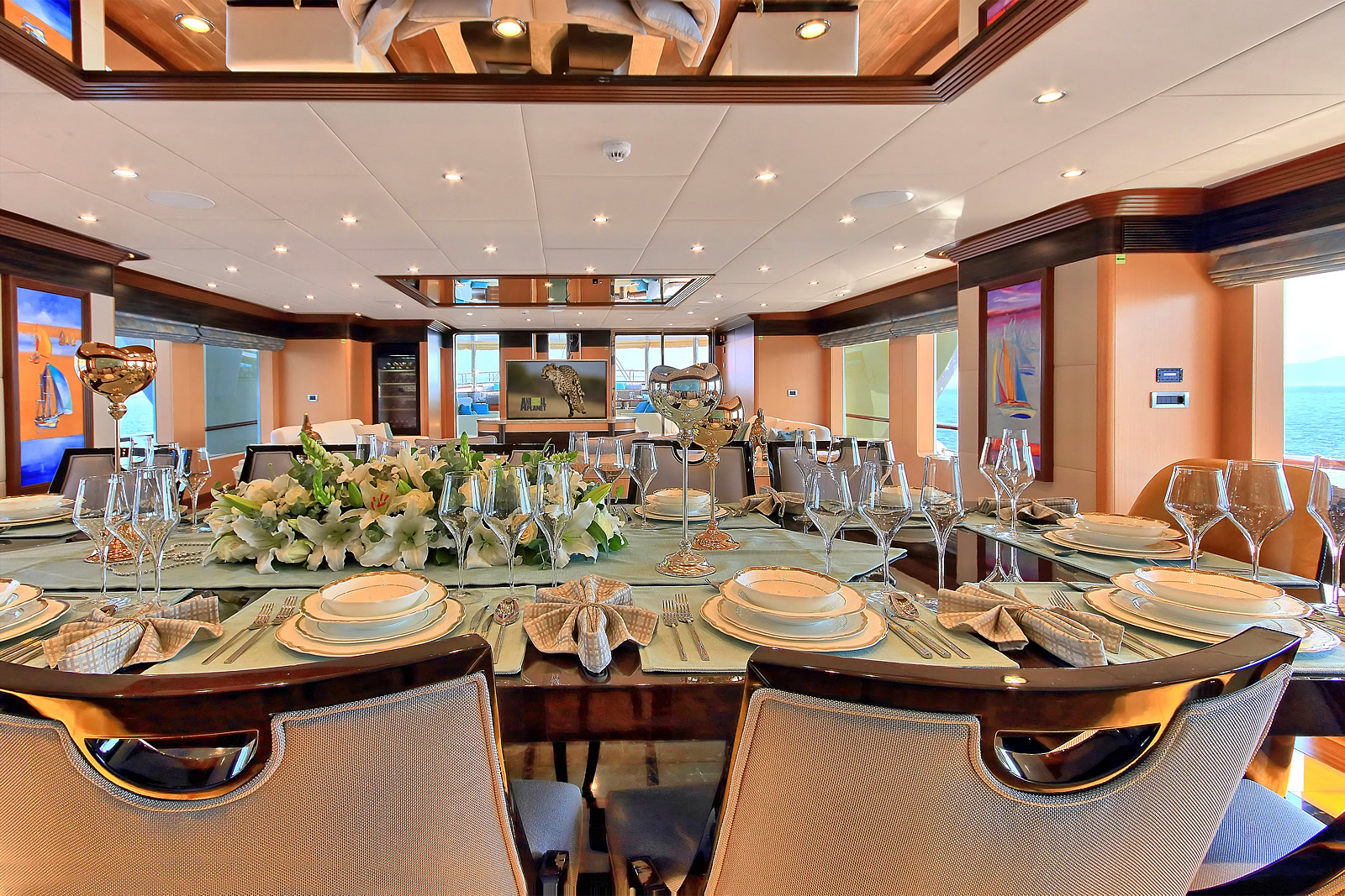 Accommodation comprises 1 master stateroom, 3 VIP cabins and 2 twin cabins, all of which have the most up to date entertainment systems and features to make your charter extremely comfortable.