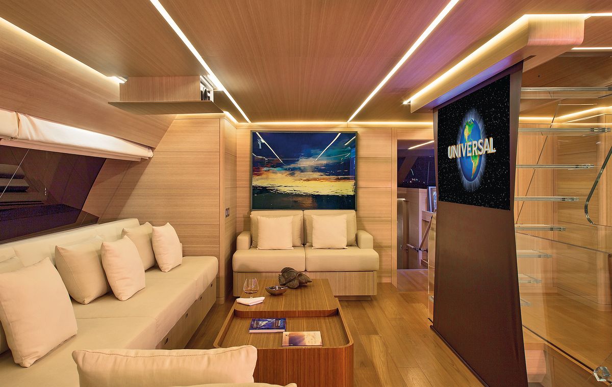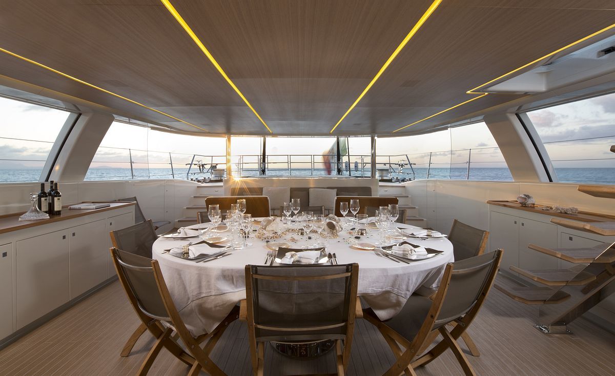 A spacious main saloon includes an elegant dining area that has a beautiful black marble dining table while offering unprecedented views thanks to the large starboard windows and the glass floating stairs. The saloon’s lounging area includes a bar, a cinema and glass floating stairs to the flybridge. The exterior area of the main deck offers another dining possibility, this time alfresco as well as an additional seating area.