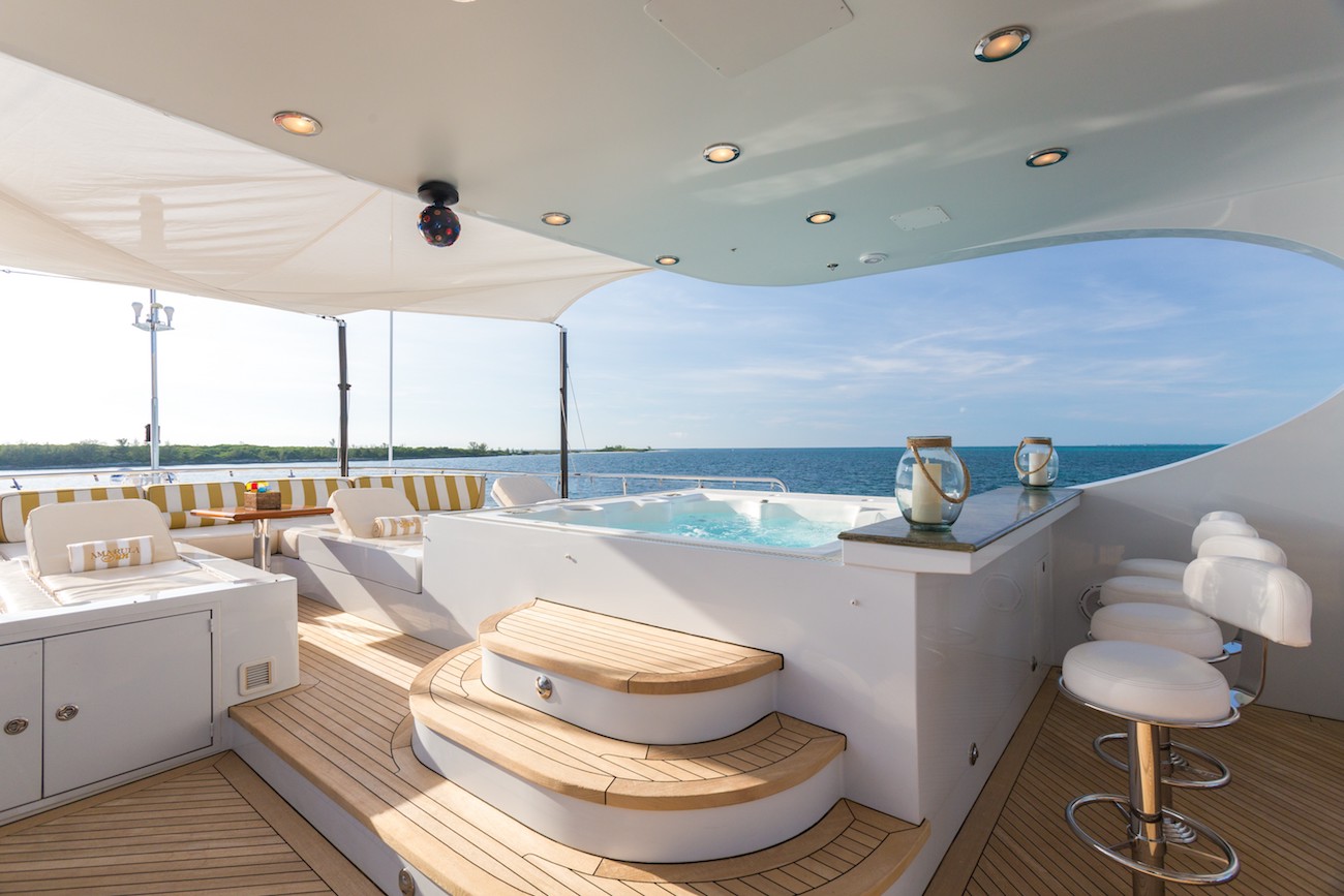 M/Y AMARULA SUN is perfect for your luxury Bahamas yacht charter, providing 3 wonderful exterior decks to enjoy. On the aft main deck is a shaded outdoor lounge, perfect for relaxing with a cool cocktail, this area is adjacent to the salon and also leads to the extended swim platform, where a vast array of water toys are available. The upper deck features shade, seating and alfresco dining, Her sundeck is capacious, offering sunning areas, a BBQ station, wet bar, alfresco dining and Jacuzzi.