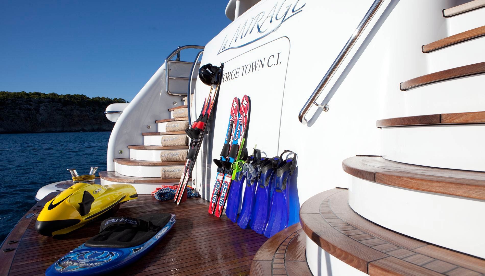M/Y LA MIRAGE is a tri-deck designed Amels motor yacht, boasting plenty of outdoor living, perfectly suited to luxury charters cruising France and Italy. The main aft deck benefits from shade provided by the upper deck, where there are a comfortable seating arrangement and table. Further aft, steps on the transom go down to the swim platform and an excellent selection of water toys available.