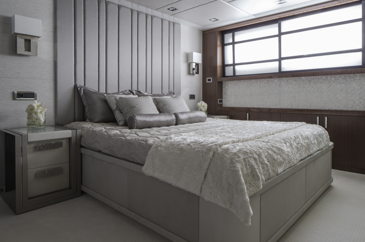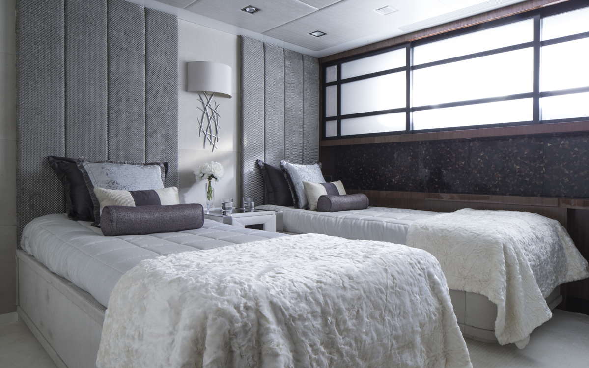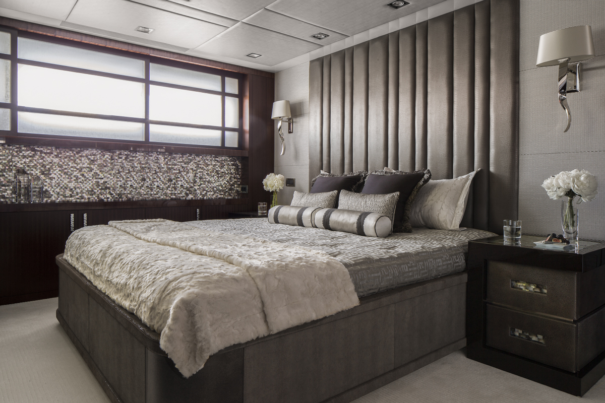 Here the refit comprised new cabinetry work, furniture, headboards, carpets, fabrics, lighting, and new AV system that has been changed throughout. Numerous original features have been kept, however have been refinished, covered and personalised to the new interior.