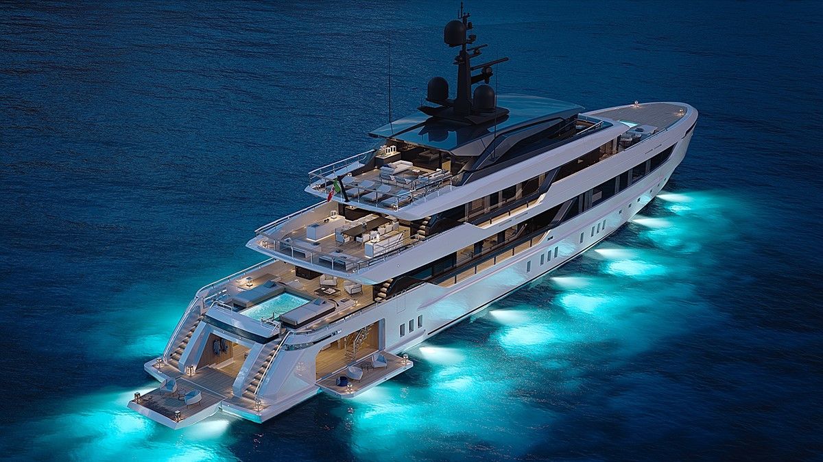 Deck renderings show a tri-deck yacht with all the features owners could imagine; a glass bottomed swimming pool, 110sqm beach club further extended by fold-out doors at the stern on either side.