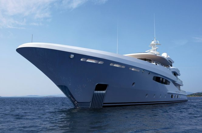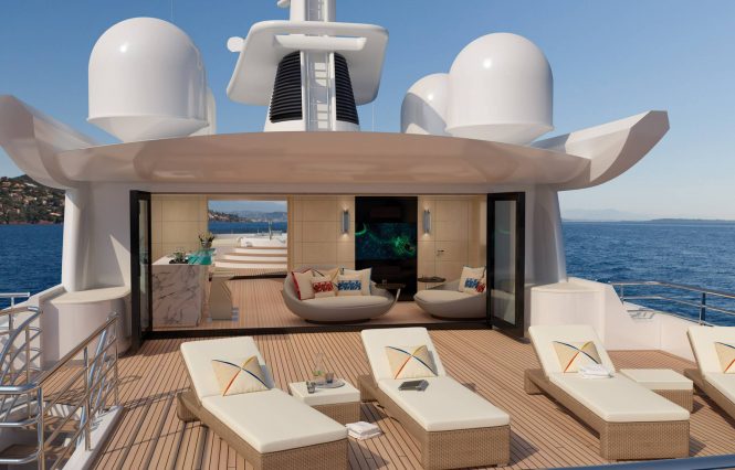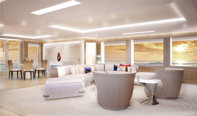 Accommodation layout comprises an 80 sqm master suite, a VIP suite, two double and two twin cabins. A total of 12 guests can stay overnight, while a crew of 12 will take care of everything onboard.