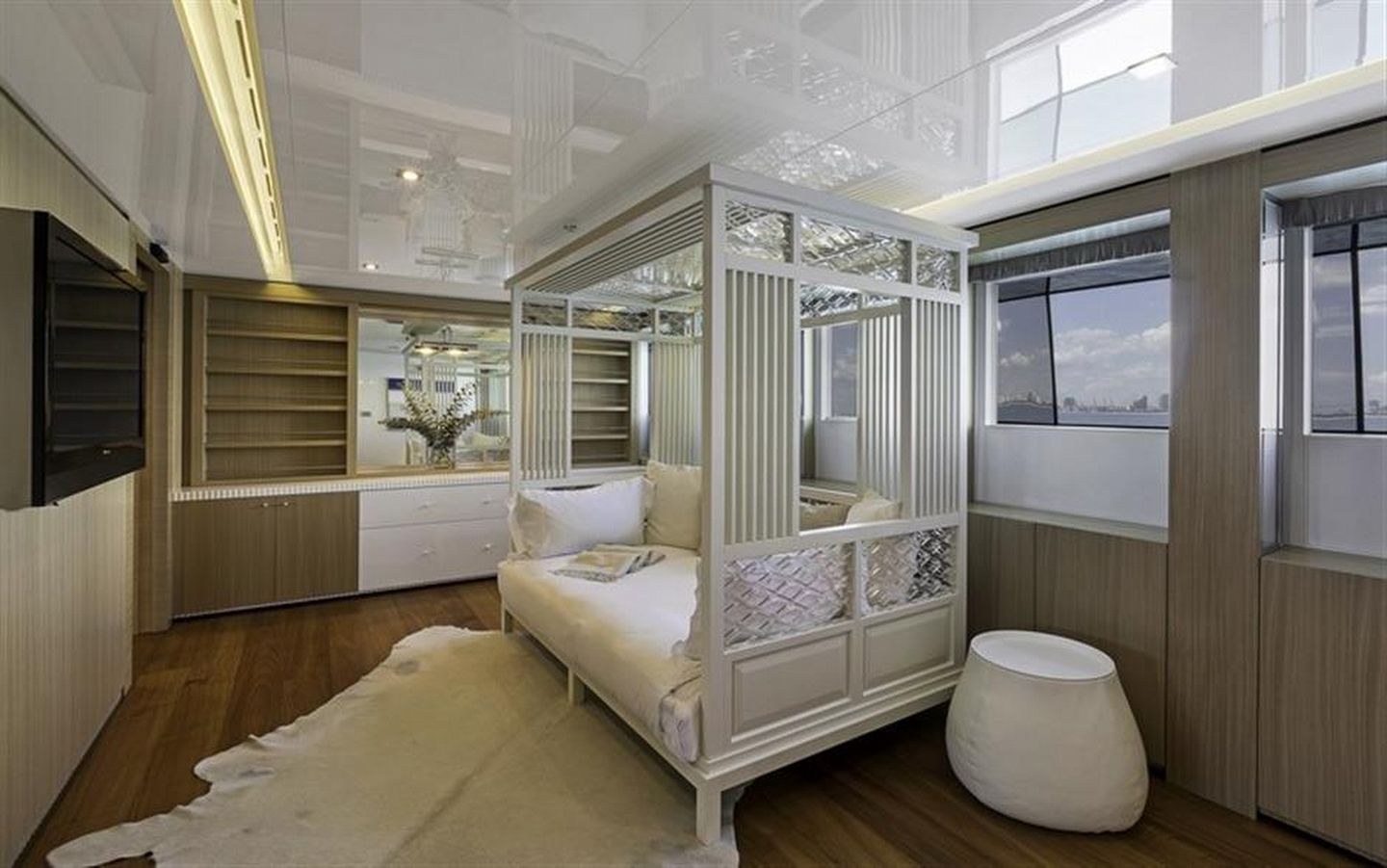 On the main level upon entering from the stern is a cocktail bar, followed by a generous lounge and then the formal dining area. Included on the main deck are the master stateroom and one double cabin. Steps lead up to the upper bridge deck, where a further lounge, steam room and massage area are situated. The lower deck has 4 additional guest cabins, comprising a VIP, double and 2 twin suites. Further to the lower deck is a cosy lounge with an aquarium.
