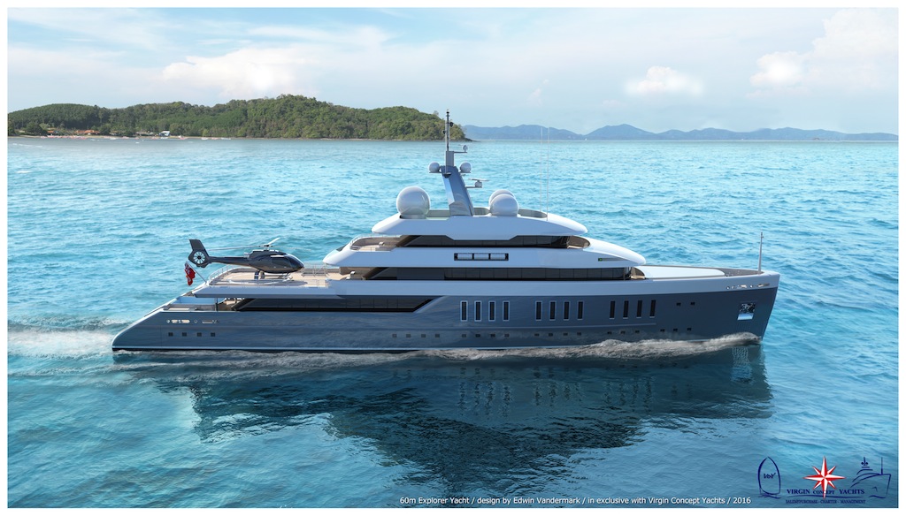 The new 60-metre (197ft) Explorer yacht by Virgin Concept Yachts was designed with ocean-going explorer layout, which combines amenities of a luxury yacht with the requirements needed for vessels undertaking global voyages and extended self-sufficient operations in remote areas, while reducing their ecological footprint by as much as possible.
