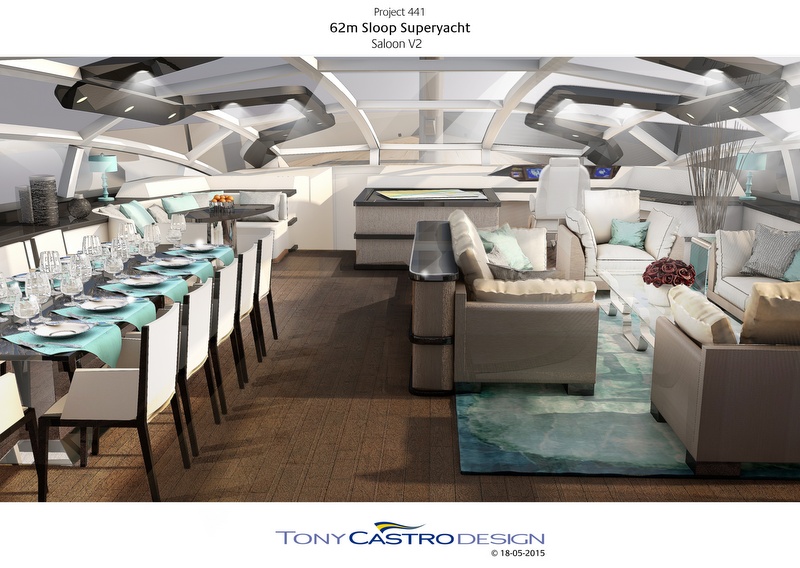 The all-new 62m performance sloop project by Tony Castro Yachts is a fast, sleek and sexy vessel, first introduced by the world class UK-based design studio at the London Yacht, Jet and Prestige Car Show. Also known as Project 441, this impressive 62m design was developed in order to reach the 500GRT limit with the largest possible sailing yacht. Above this limit the rules become more onerous and the vessel is more expensive to build and operate.