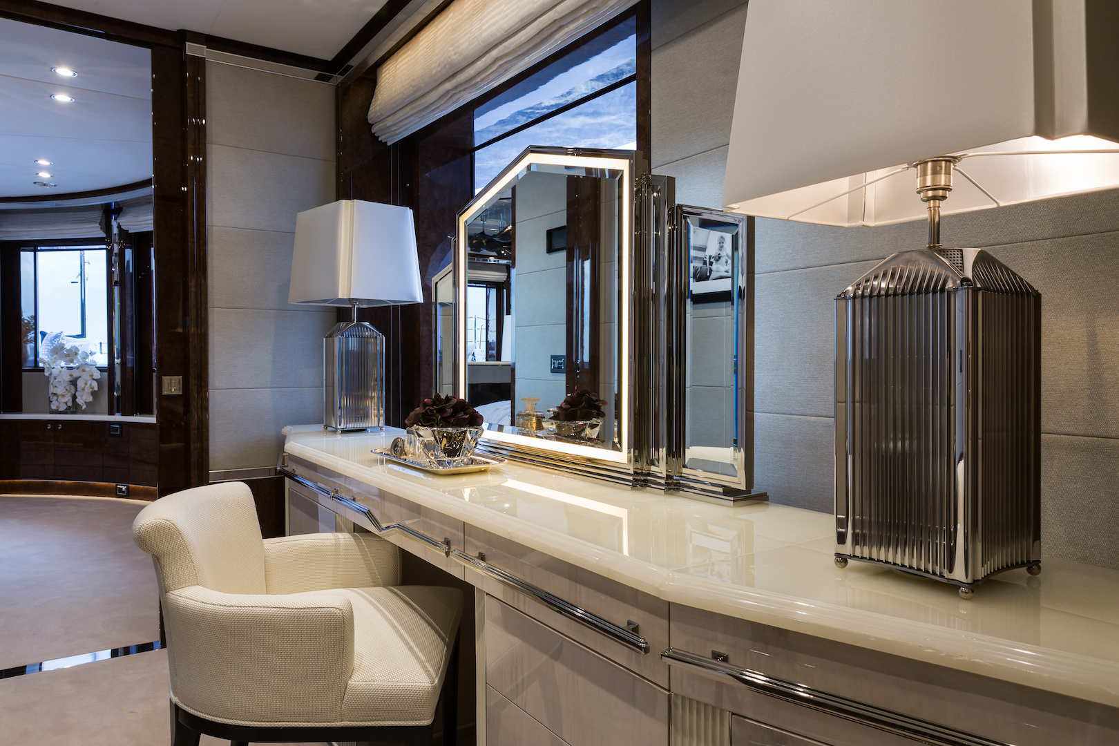 Her interiors feature the finest in Italian marbles, bespoke art and a clean crisp ambience. The main level, offers an open plan salon with formal dining, followed by a foyer leading to the master stateroom, complete with a full beam layout, walk-in wardrobe, study, private balcony and deluxe jacuzzi. On the upper deck are a well-appointed sky lounge, cocktail bar, comfortable sitting space and a games table. This deck boasts a generous VIP suite, showcasing panoramic views. Further accommodation is situated on the lower level, comprising 2 double and 2 twin cabins.