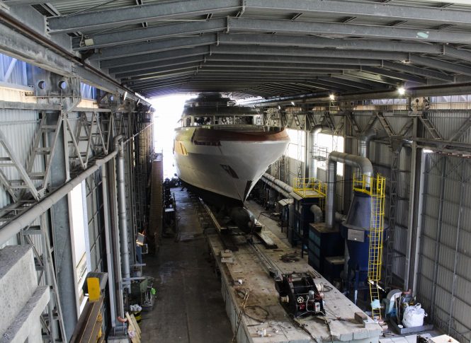 Codecasa shipyard has announced that the construction of their 65m superyacht F74 was well on track with expected delivery in summer 2019. She is being built with a steel hull and aluminium superstructure, featuring naval architecture and exterior design by Codecasa. The interiors are being created by the owner’s team in collaboration with the shipyard.